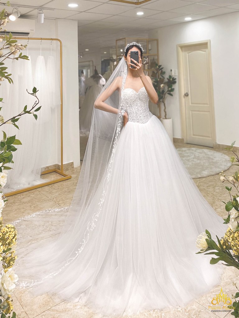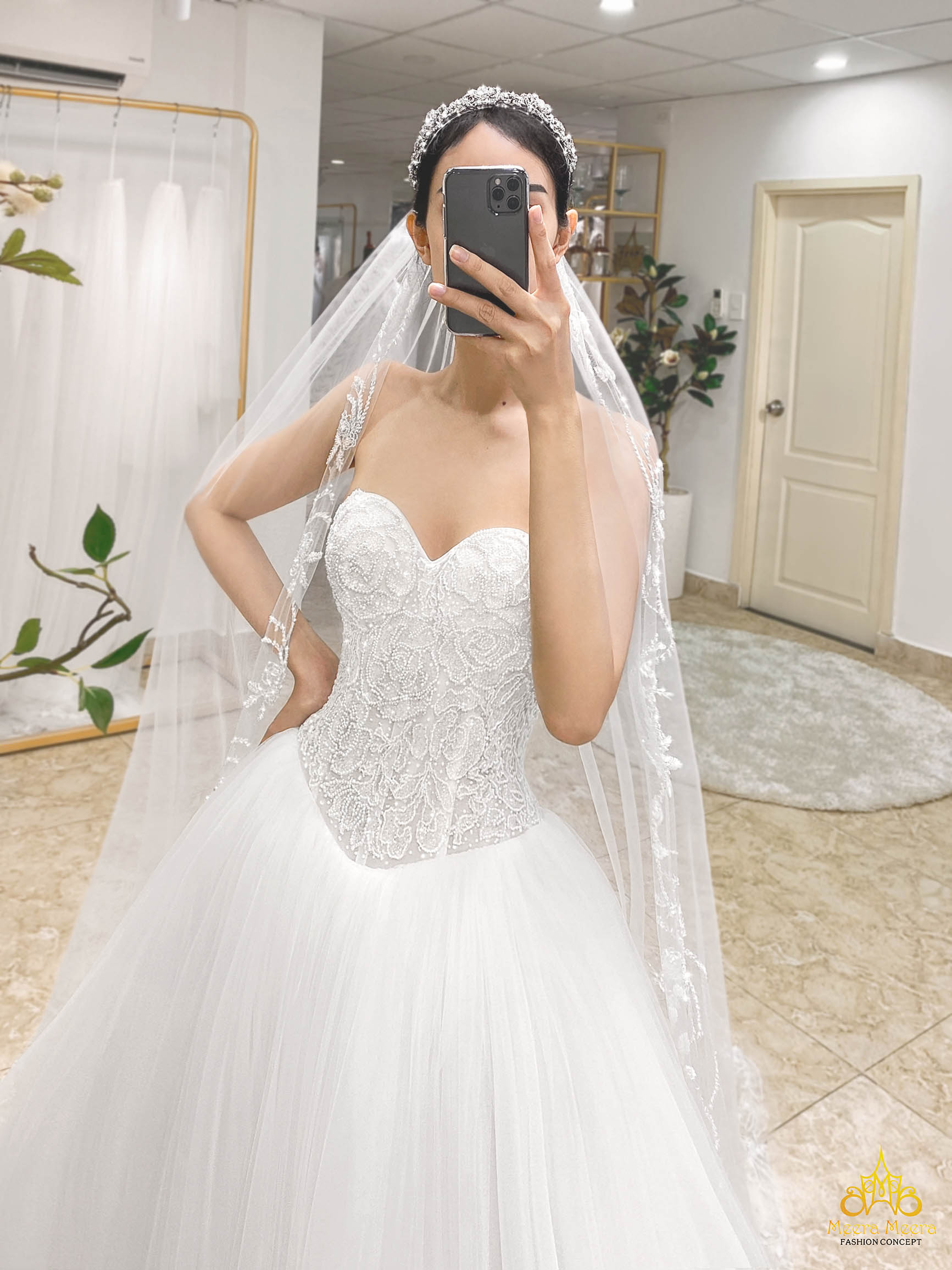 ÁO CƯỚI CÔNG CHÚA HẠ EO TÙNG LƯỚI PHỐI MẠN CHE MẶT THƠ MỘNG. MÃ MM4065