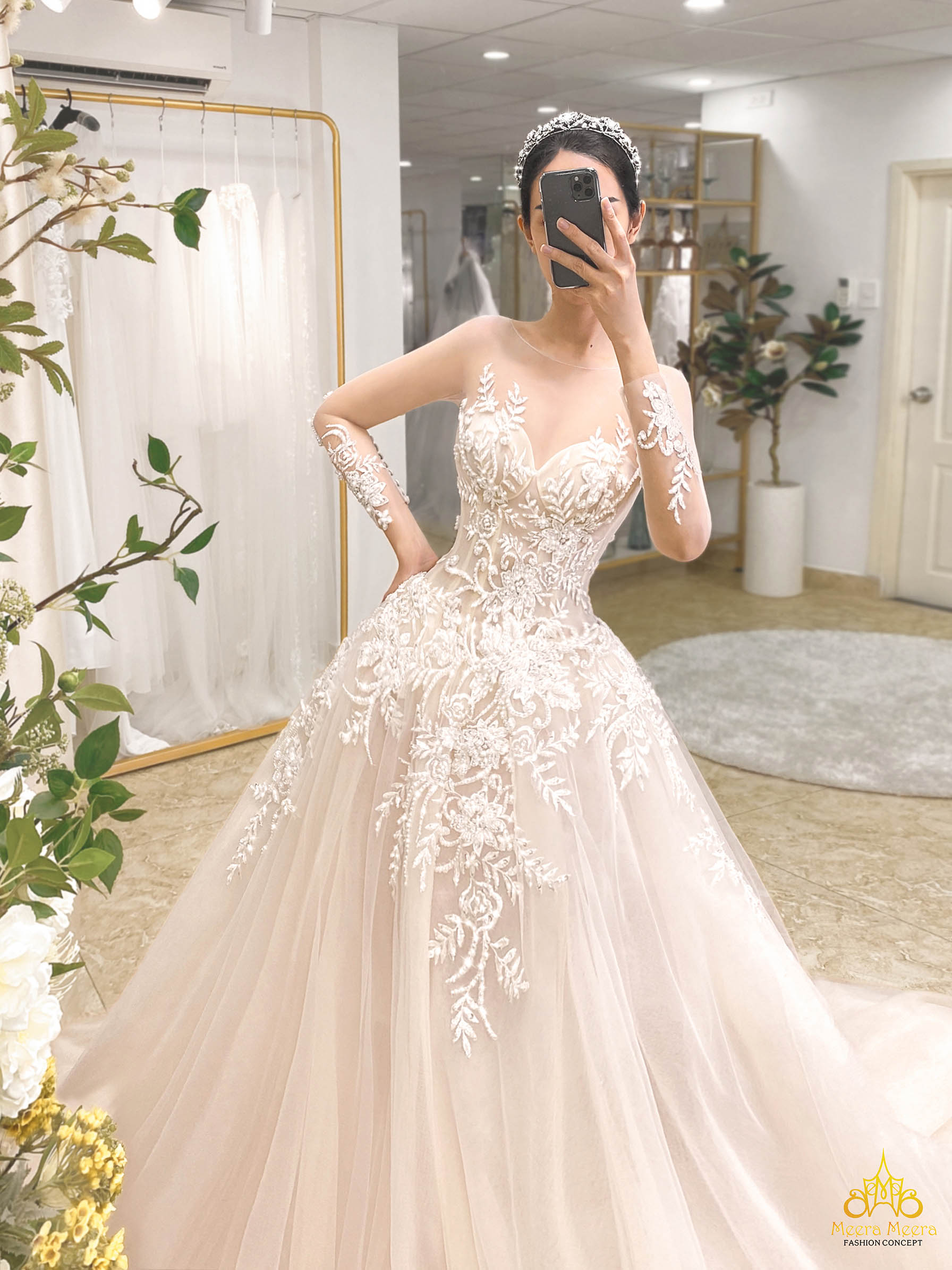 ÁO CƯỚI CÔNG CHÚA LƯỚI MÀU DA HẠ EO TAY DÀI XUYÊN THẤU ĐÍNH ĐÁ. MÃ MM4077