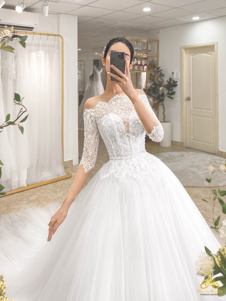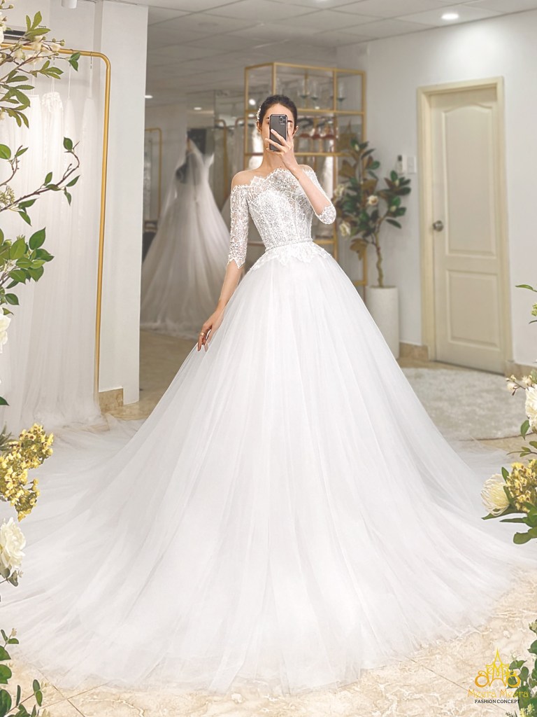 ÁO CƯỚI CÔNG CHÚA TÙNG LƯỚI TRỄ VAI THÂN REN SANG TRỌNG. MÃ MM4103