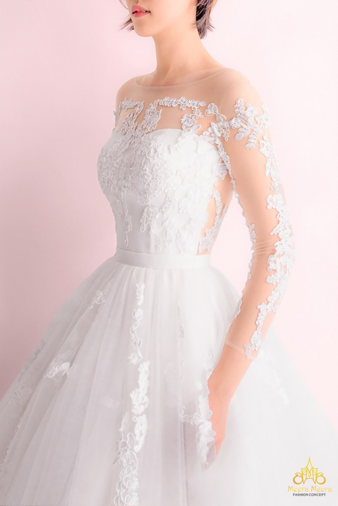 ÁO CƯỚI CHỮ A REN TAY DÀI XUYÊN THẤU XẺ LƯNG PHÁ CÁCH. MÃ KH1735