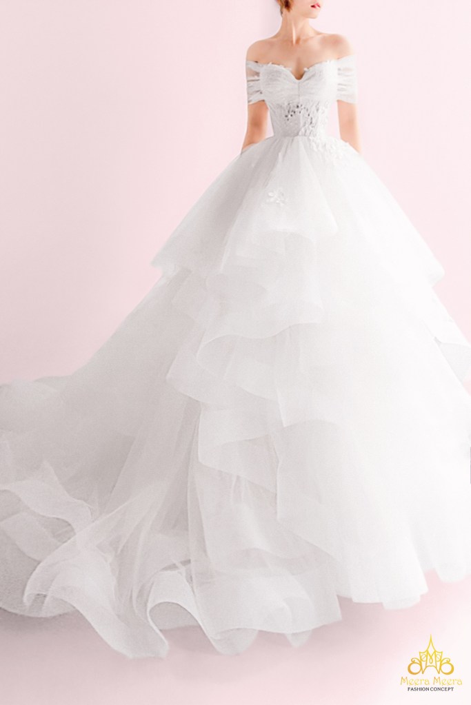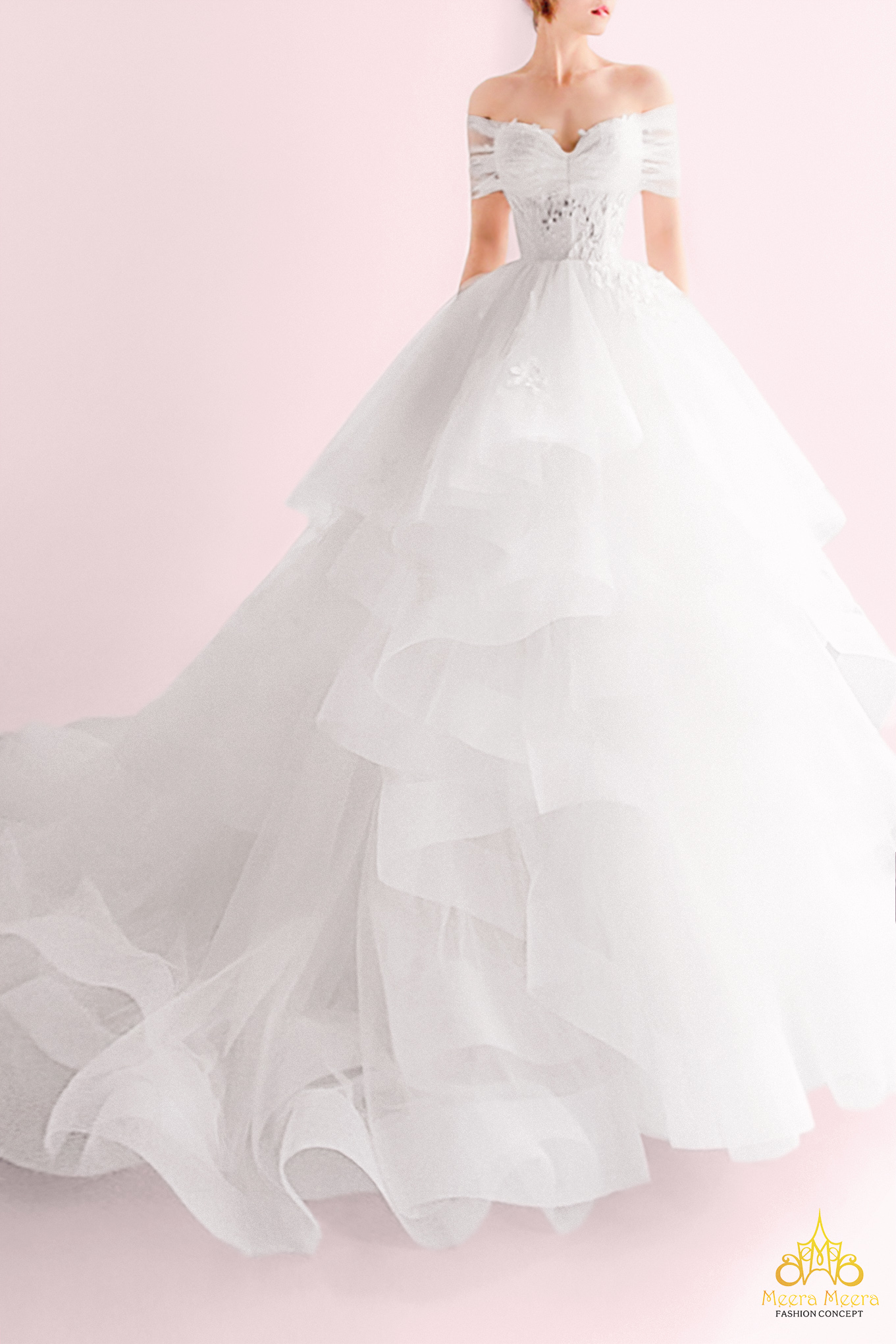 ÁO CƯỚI CÔNG CHÚA TRỄ VAI XẾP TẦNG ẤN TƯỢNG KH1766