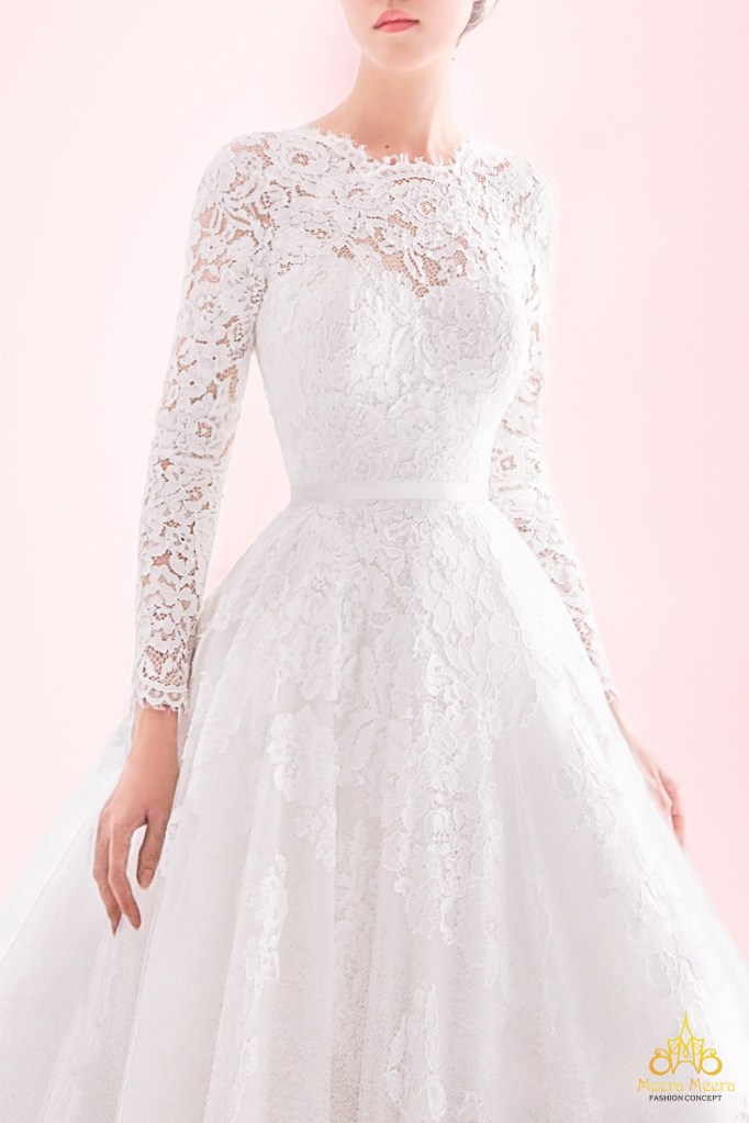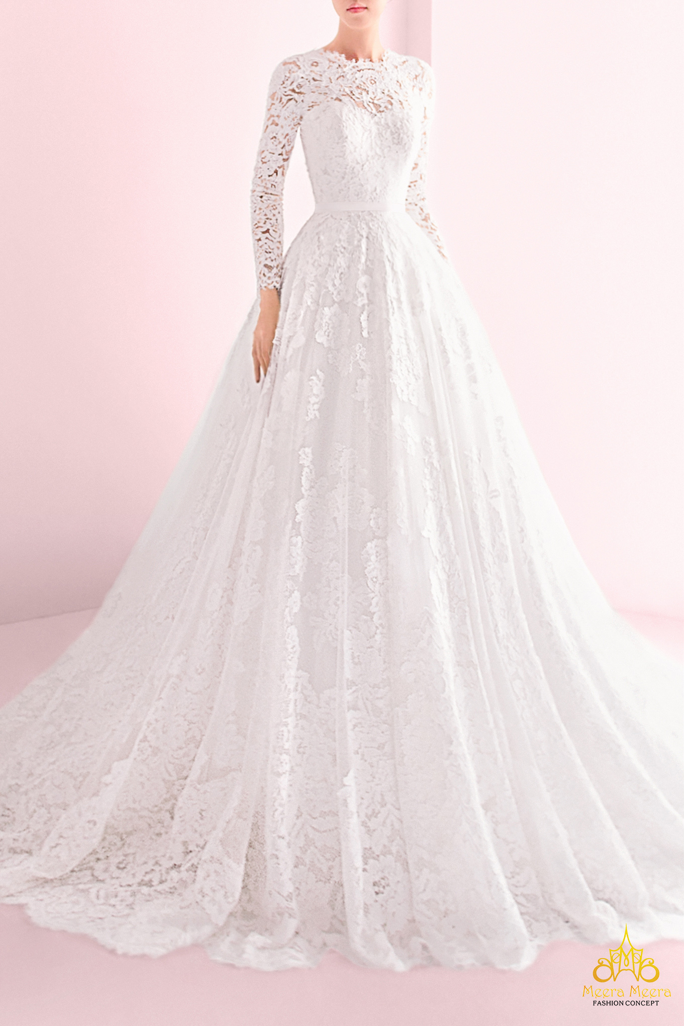 ÁO CƯỚI CÔNG CHÚA TAY DÀI THÊU REN ALENÇON PHONG CÁCH HOÀNG GIA. MÃ KH1708