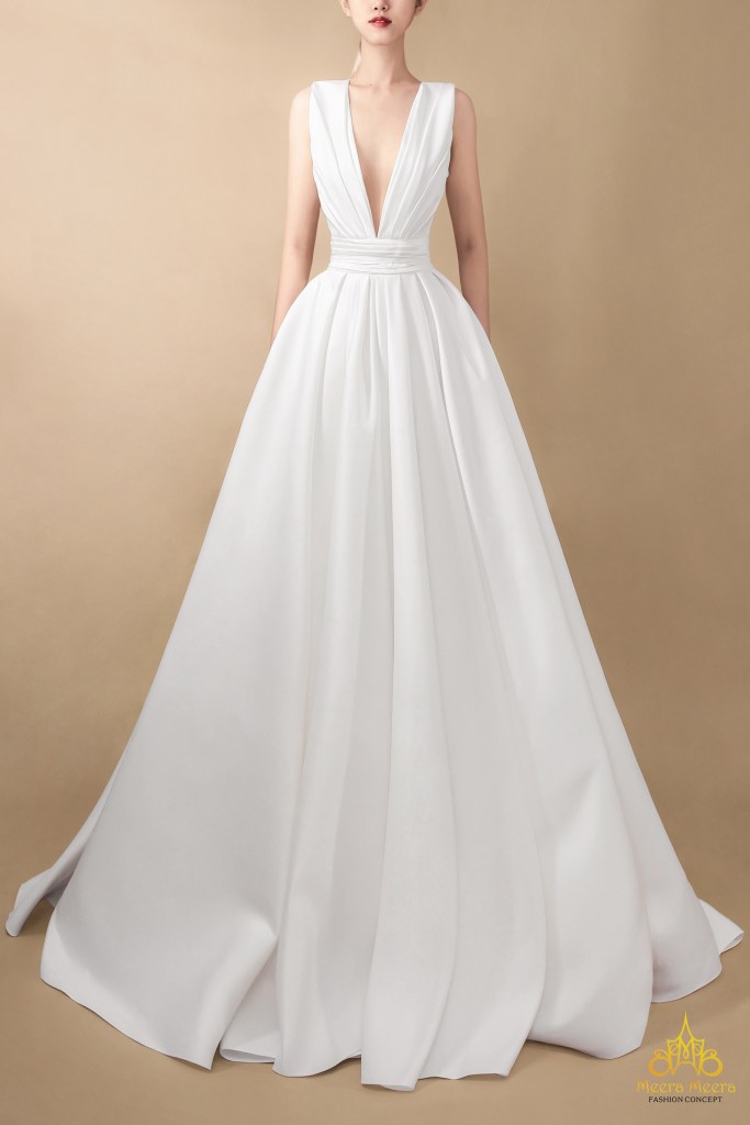 ÁO CƯỚI CHỮ A SATIN XẺ NGỰC XẾP LI CÁ TÍNH PHONG CÁCH TỐI GIẢN MINIMALIST. MÃ KH3926