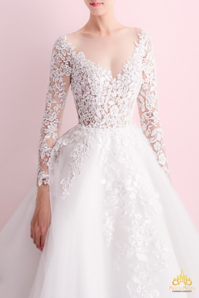 ÁO CƯỚI CHỮ A LƯỚI TAY DÀI XUYÊN THẤU PHỐI REN GỢI CẢM. MÃ KH1615