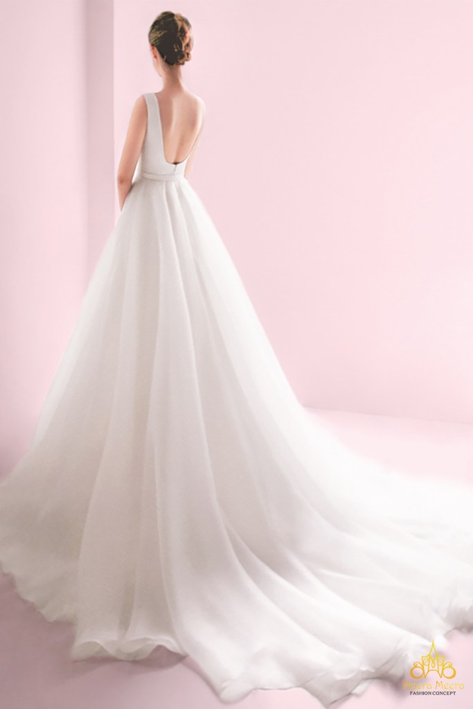 ÁO CƯỚI CHỮ A TÙNG CHUÔNG VOAN CỔ CAO HỞ LƯNG MINIMALIST. MÃ KH1581