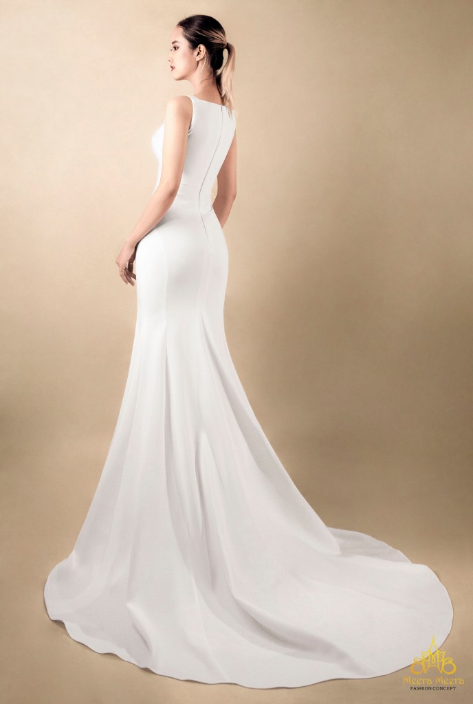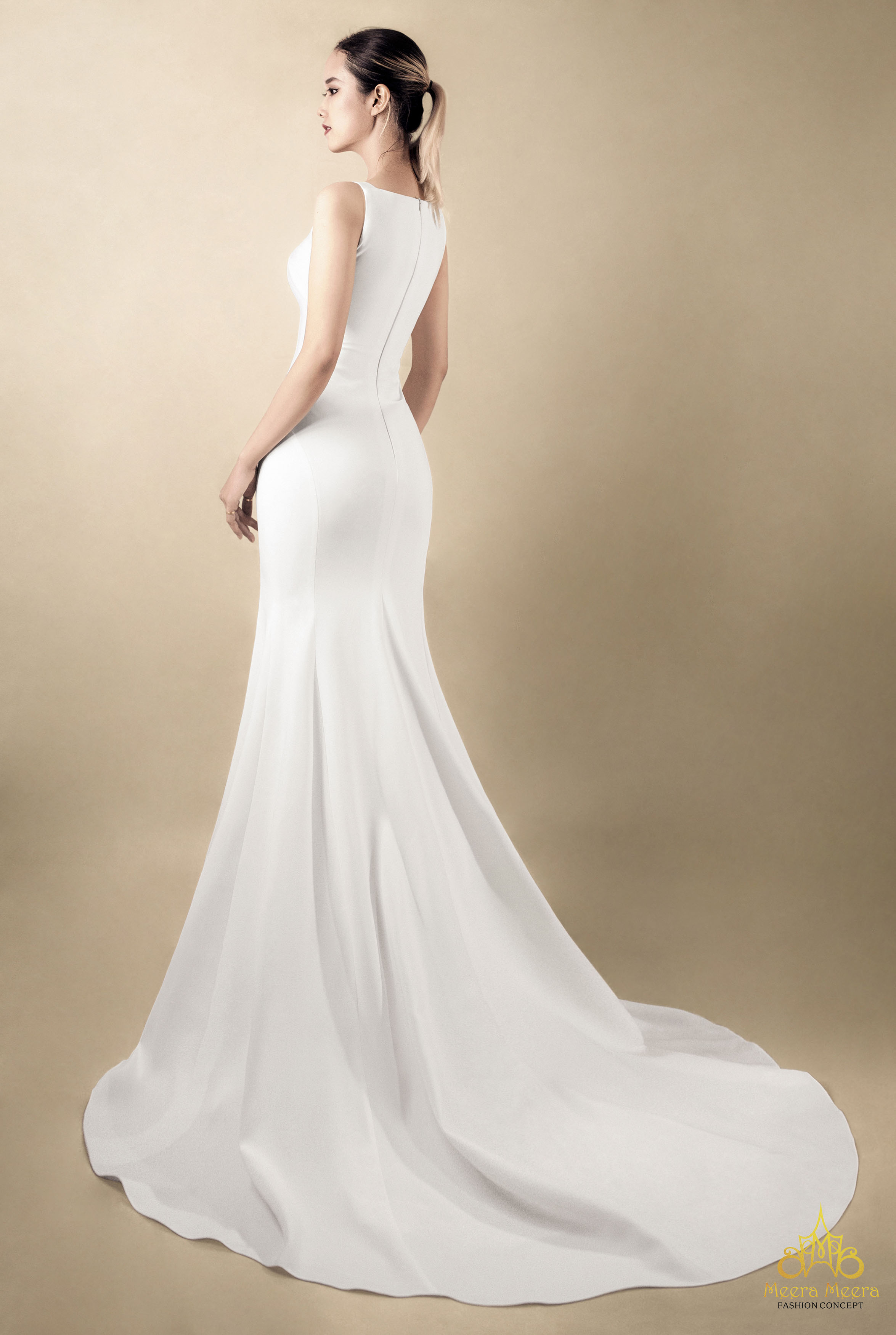 ÁO CƯỚI ĐUÔI CÁ LỤA CREPE CỔ YẾM PHONG CÁCH TỐI GIẢN MINIMALIST. MÃ KH3929