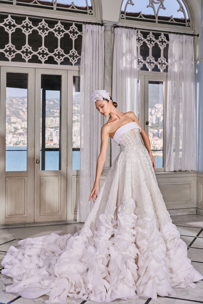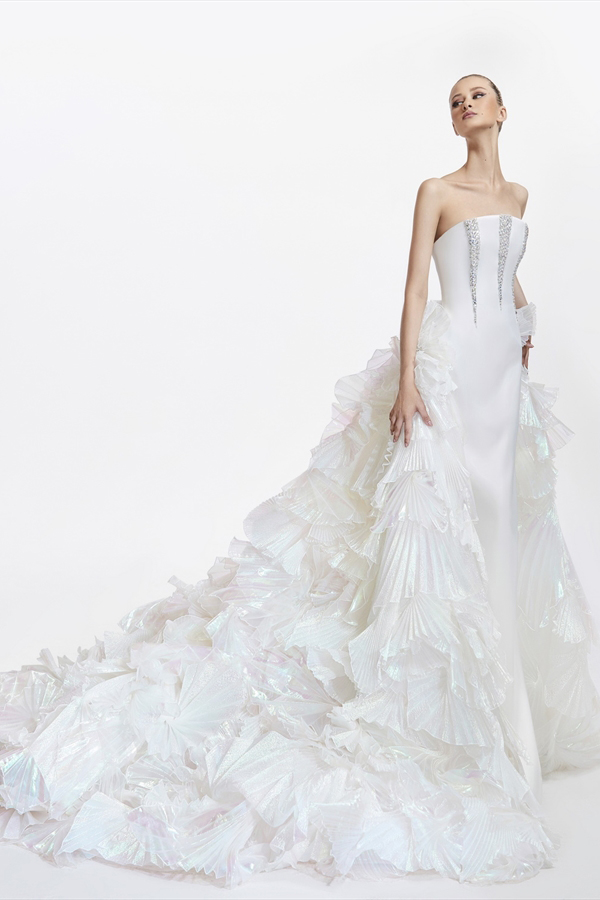 Georges Hobeika vốn được biết đến với những thiết kế điệu đà đã không làm cô dâu phụ lòng khi gửi đến một mẫu thiết kế váy cưới xếp bèo gợn sóng, cô dâu sẽ nổi bật với cúp ngực tim khoe xương quai xanh cùng tùng váy dập ly xếp bèo bất đối xứng tựa như một đoá hoa nở rực rỡ.