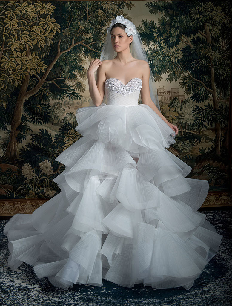 Nhắc đến sự phá cách và cầu kỳ không thể không nhắc đến Krikor Jabotian, nhà mốt Li Băng nổi tiếng với những thiết kế vô cùng lộng lẫy đã mang đến cho cô dâu mẫu váy cưới công chúa hạ eo độc đáo, toàn bộ tùng váy xếp múi được dún bèo trên tone màu da cuốn hút.