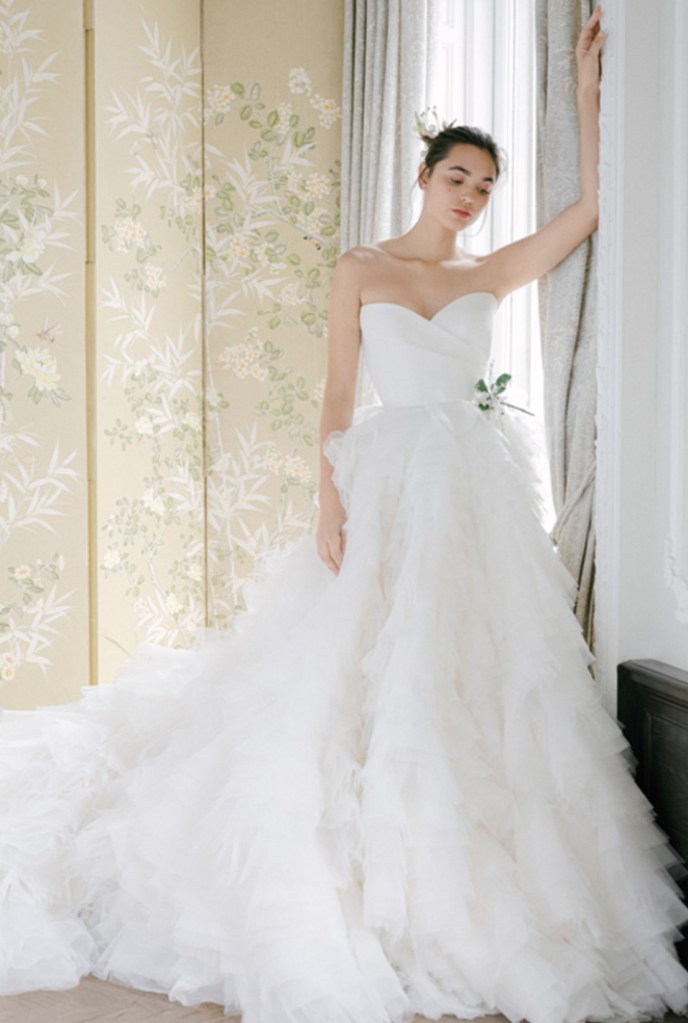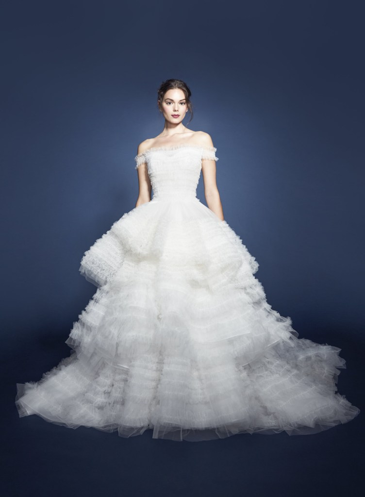Nếu bạn không thích xếp bèo tầng toàn thân váy, hãy tham khảo mẫu váy cưới của Tony Ward. Váy cưới công chúa xoè nhẹ có cúp ngực ngang thời trang, thân váy thêu ren kết hạt lấp lánh và xếp bèo gợn sóng dưới đuôi tạo thành những đợt sóng chảy dưới chân bạn.