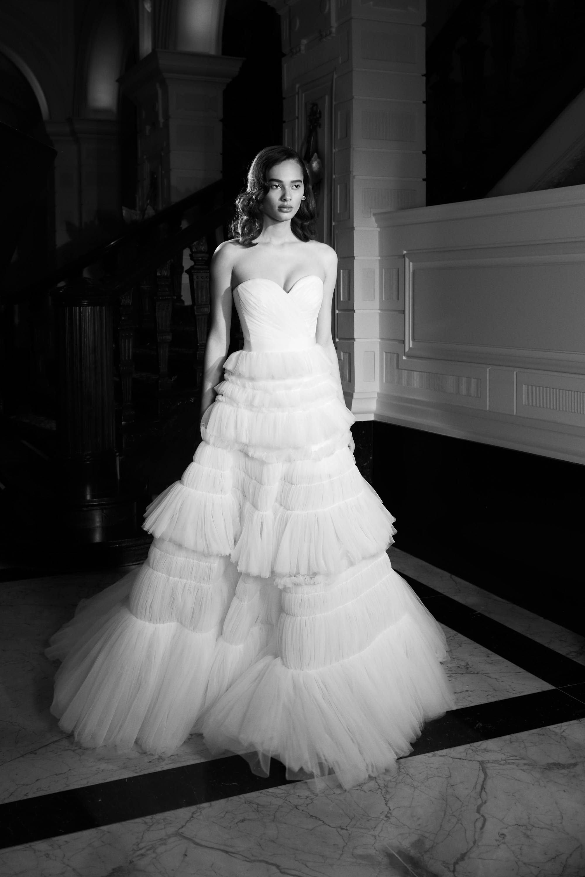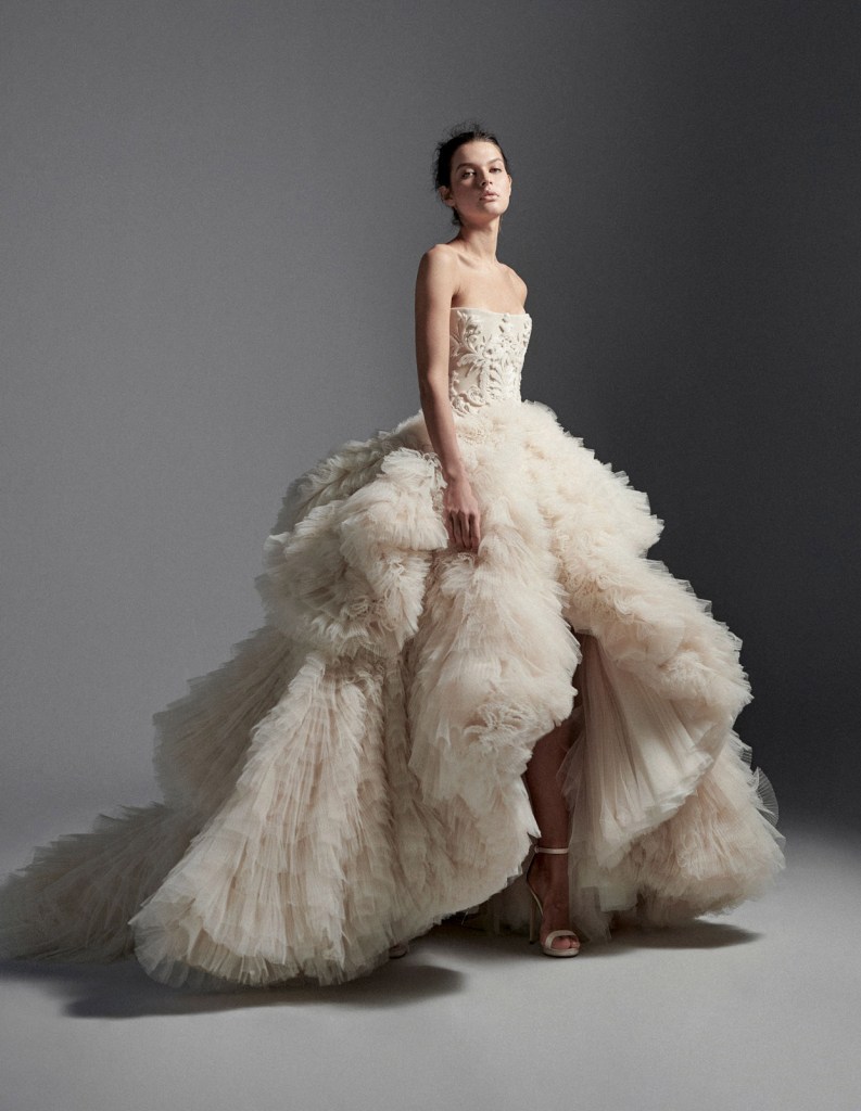 Thêm một gợi ý phá cách đến từ nhà Tony Ward, mẫu thiết kế ôm suôn kèm tùng xoè lộng lẫy bên ngoài, từng lớp bèo xếp tầng được dập li tạo nên hiệu ứng thị giác vô cùng mãn nhãn cho cô dâu.