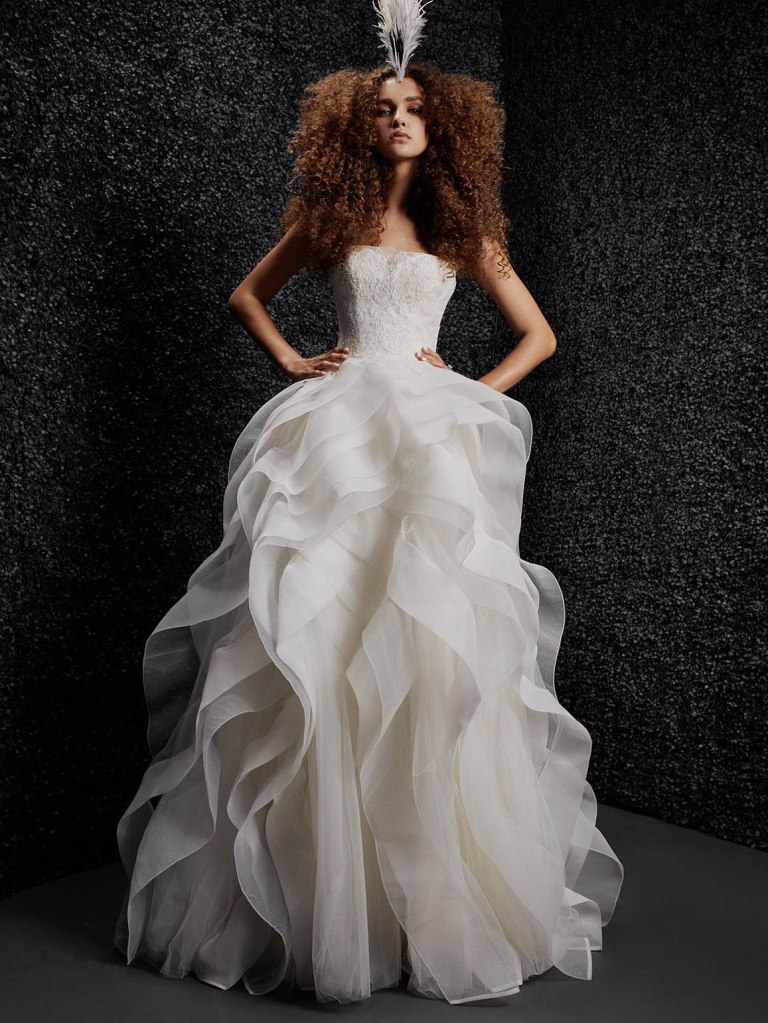 Vẫn với những thiết kế dún bèo tầng trứ danh, “bà tiên váy cưới” Vera Wang mang đến cho cô dâu tương lai một chiếc váy cưới xếp bèo bất đối xứng vô cùng ấn tượng, đây cũng là một trong những kiểu váy cưới lạ mắt mà cô dâu không thể bỏ qua trong năm nay.