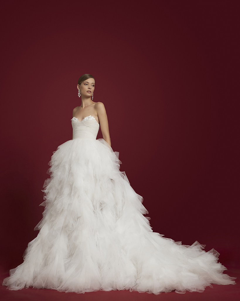 Thương hiệu Pronovias tiếp tục bắt tay cùng nhà mốt Marchesa để mang đến cho cô dâu tương lai chiếc váy cưới công chúa xếp bèo đầy nữ tính.