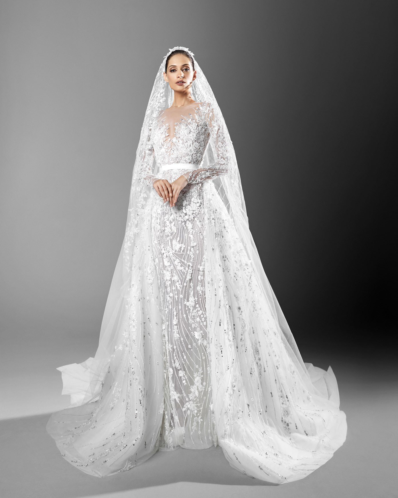 Mẫu váy cưới 2 trong 1 với tay dài cùng chi tiết đính kết toàn thân kín đáo, phối kèm khăn voan che mặt sẽ giúp bạn trở nên toả sáng lộng lẫy trong nhà thờ.