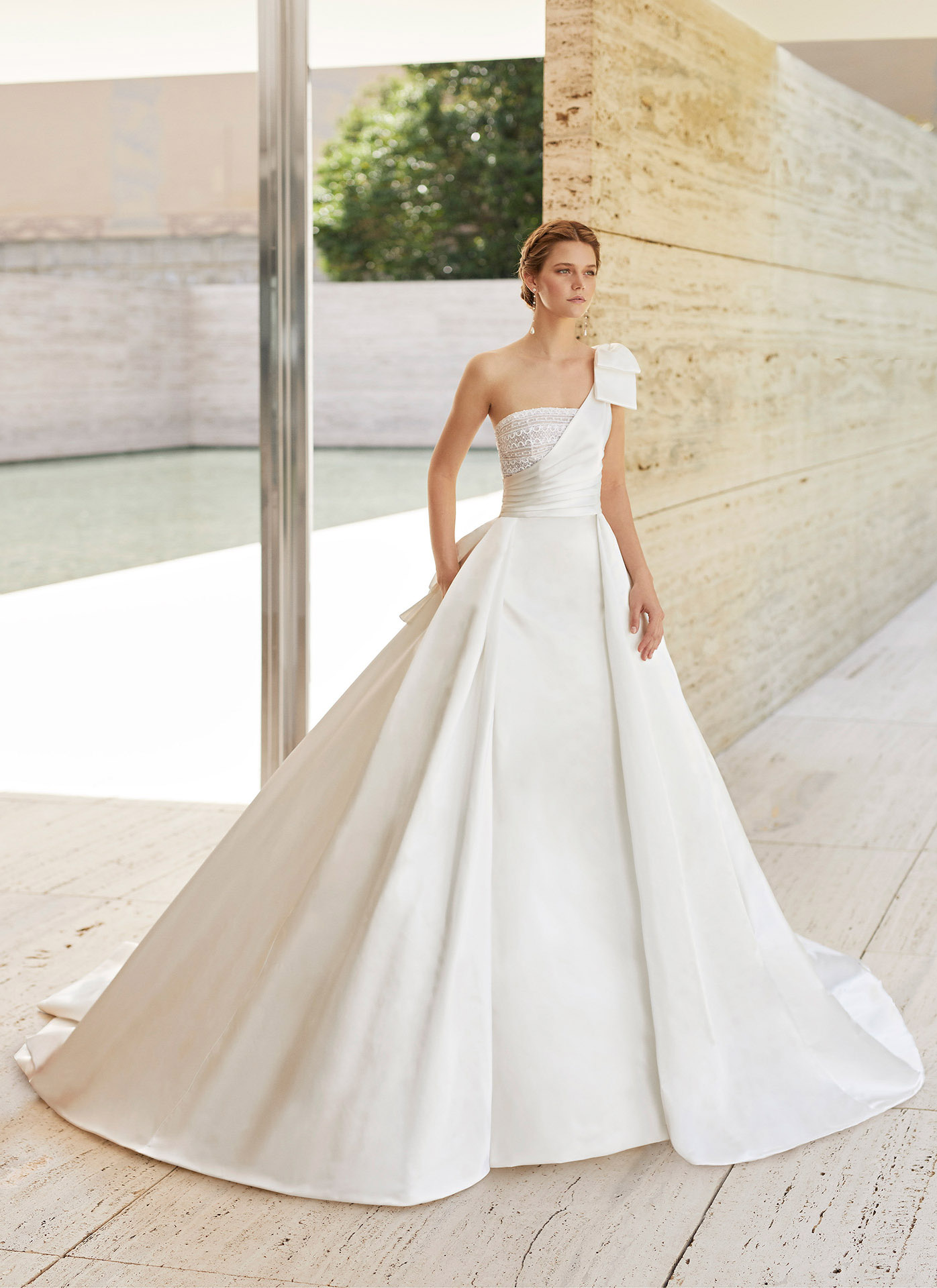 Nếu yêu thích phong cách cưới tối giản minimalist mà vẫn muốn được lộng lẫy, cô dâu hãy chọn cho mình mẫu váy cưới tuyệt đẹp đến từ thương hiệu Rosa Clara nhé! Chiếc váy cưới thực hiện trên chất liệu satin với điểm nhấn bắt mắt là chi tiết lệch vai ấn tượng.