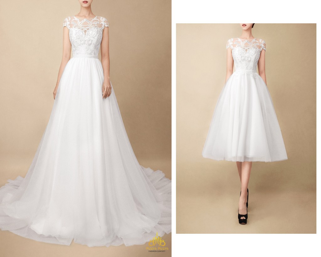 Bạn vừa mong muốn có một chiếc váy cưới làm lễ trang trọng, lại có thể dễ dàng biến hoá thành váy đi bàn? Mẫu váy cưới 2 trong 1 nhà Meera Meera chính là sự lựa chọn thông minh khi đảm bảo vẻ ngoài duyên dáng trong kiểu váy chữ A tùng xoè, sau lễ cưới bạn chỉ việc cởi bỏ tùng tháo rời là đã có một chiếc váy cưới ngắn midi dress xinh xắn.