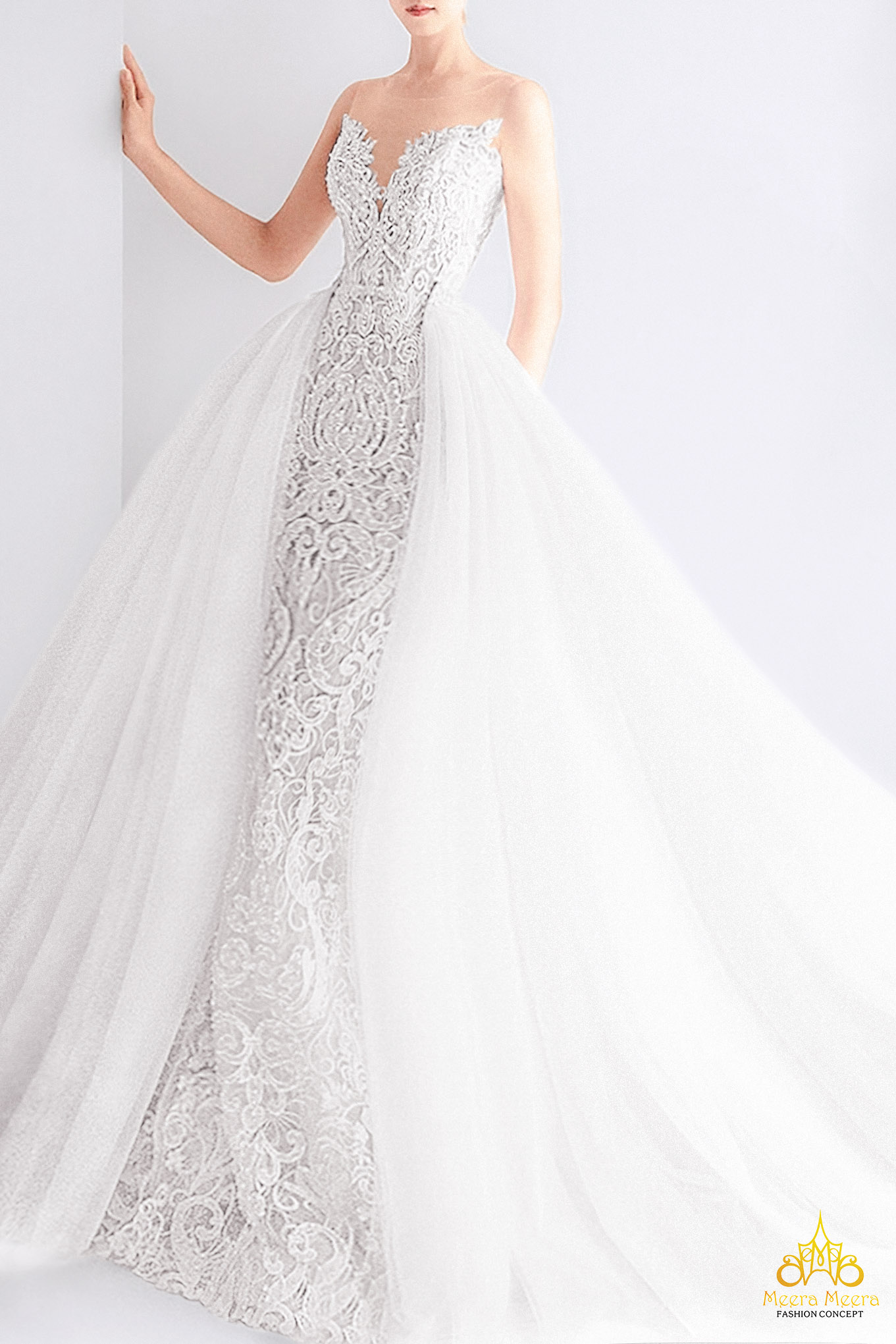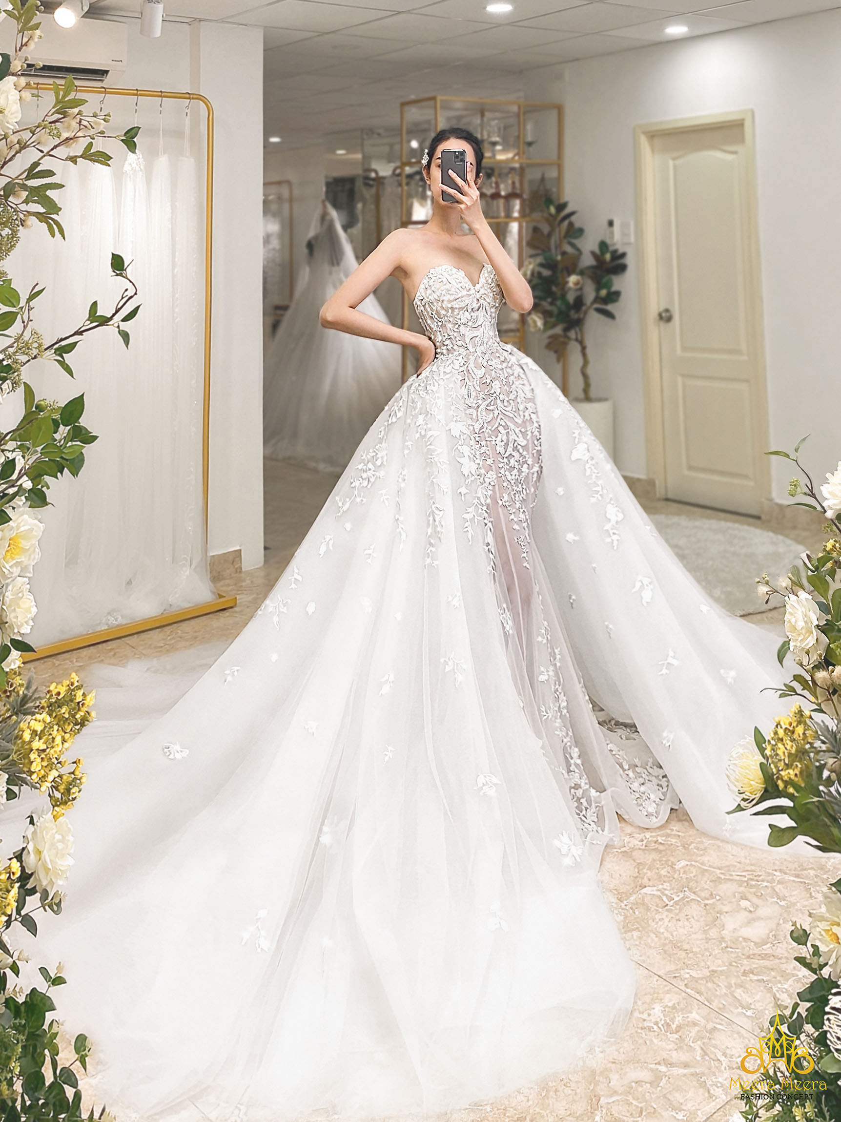 Sau cùng, chiếc váy cưới lộng lẫy nhất sẽ khiến bạn trở thành một cô dâu xinh đẹp tựa nữ thần. Hãy khoác lên mình bộ áo cưới đuôi cá 2 trong 1 nằm trong top những mẫu váy cưới bán chạy nhất của nhà Meera Meera: nổi bật với thân áo cúp ngực corset xuyên thấu khoe trọn vóc dáng đồng hồ cát, toàn bộ váy cưới được đính kết công phu và hoàn thiện ánh nhìn hoàn hảo cùng tùng váy tháo rời xoè lộng lẫy. Bạn chính là cô dâu đẹp nhất hôm nay!