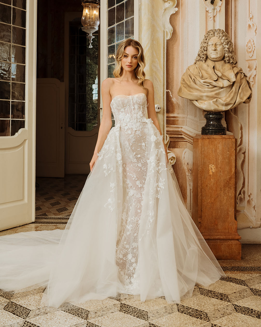 Vốn nổi tiếng với những thiết kế vô cùng gợi cảm, Berta đã tăng thêm vẻ lộng lẫy cho cô dâu khi kết hợp thêm tùng váy rời cho mẫu váy cưới đuôi cá cúp ngực corset quyến rũ.