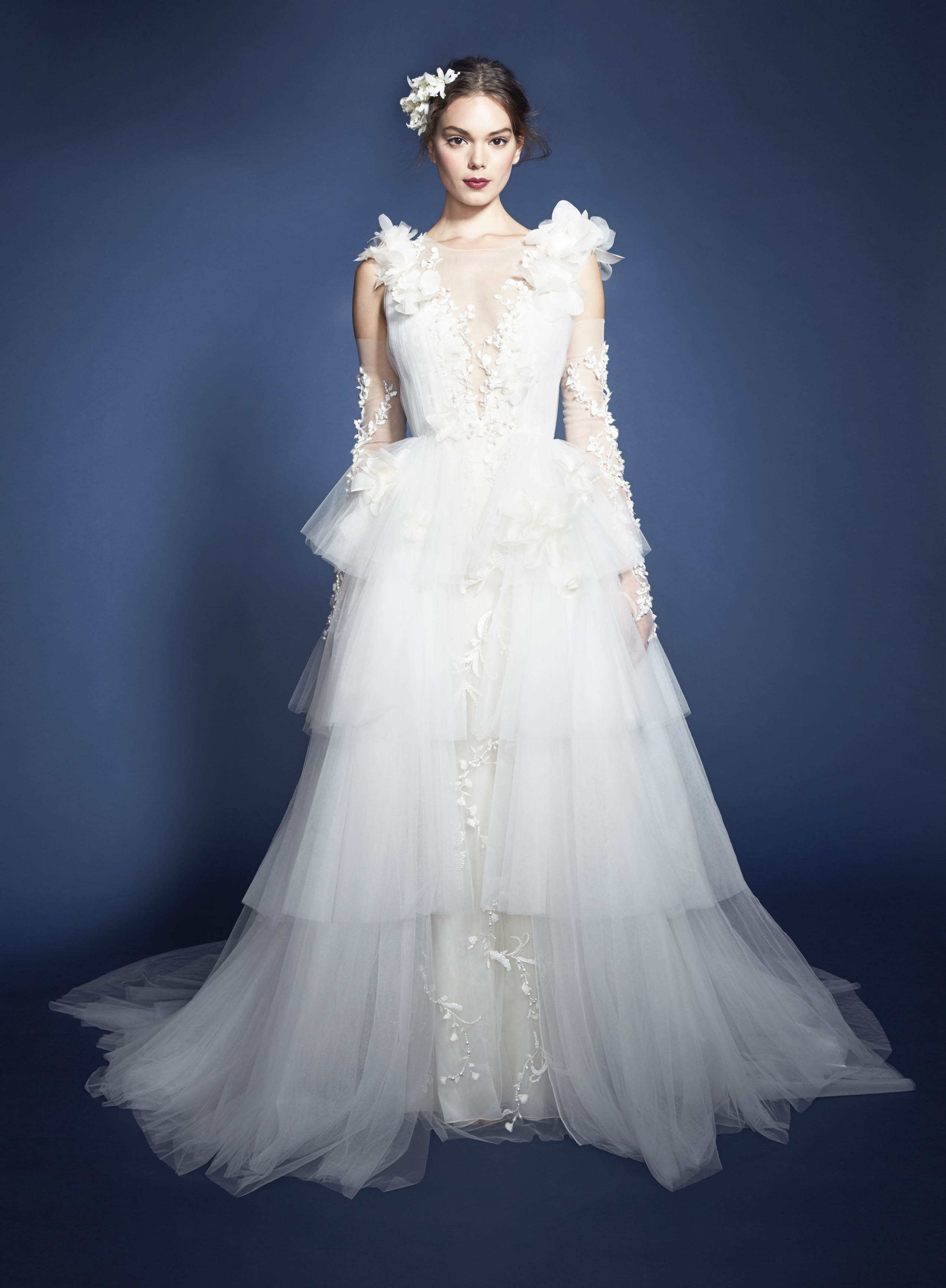 Nhà mốt Marchesa gửi đến các cô dâu tương lai mẫu váy cưới xinh đẹp kết hoa 3D sống động. Mẫu váy cưới lãng mạn và đầy ấn tượng khi kết hợp với phụ kiện tay áo rời phối cùng tùng váy lưới xếp tầng độc đáo.