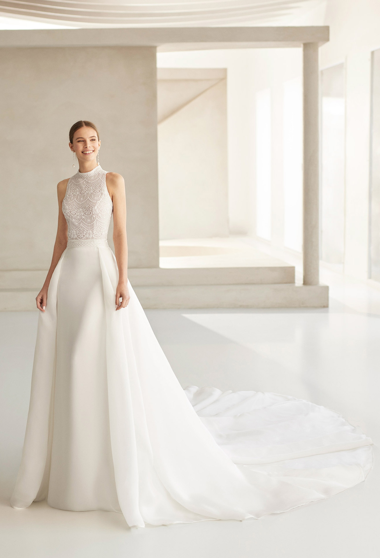 Cô dâu yêu thích sự sang trọng nhẹ nhàng nhưng vẫn có điểm nhấn có thể lựa chọn cho mình mẫu váy cưới cổ yếm 2 trong 1 của Rosa Clara.