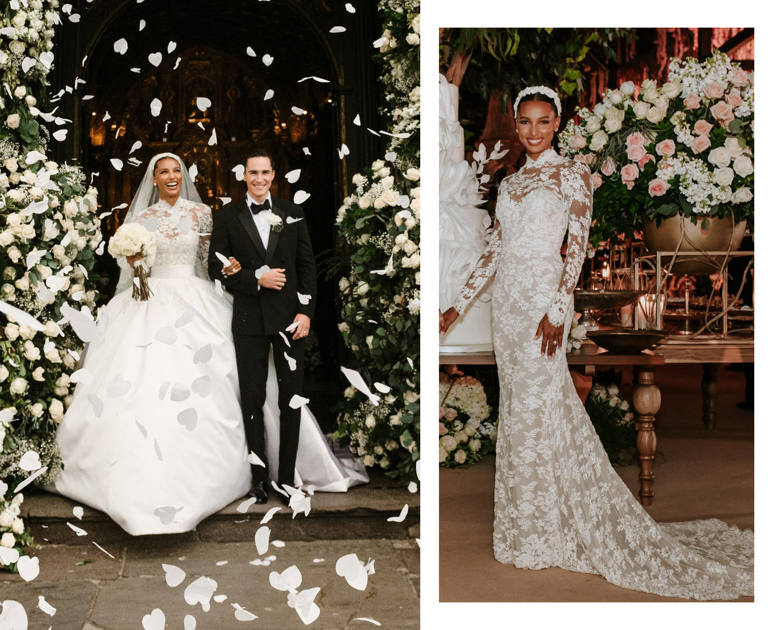 Mẫu váy cưới đình đám tiếp theo được diện bởi siêu mẫu Jasmine Tookes. Thiết kế đến từ nhà mốt nổi tiếng Zuhair Murad biến cô dâu trở thành nàng công chúa tuyệt đẹp trong hôn lễ tại nhà thờ. Sau lễ cưới, cô dâu bỏ phần tùng váy công chúa lộng lẫy và khoe body gợi cảm cùng chiếc váy cưới đuôi cá bên trong.