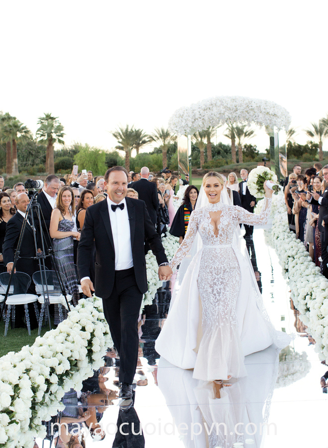 Bên cạnh đó, các cô dâu sành điệu cũng có thêm những lựa chọn linh hoạt với kiểu áo cưới đuôi cá 2 trong 1. Cô dâu Tara Juergens đẹp nức nở trong mẫu thiết kế đến từ thương hiệu Ralph & Russo với áo cưới đuôi cá cổ cao tay dài thực hiện trên nền vải lưới xuyên thấu hoàn toàn, hoạ tiết ren và chi tiết đính kết tinh xảo được sắp đặt khéo léo tạo nên đường cut out khoe khéo vòng một sexy và toàn bộ đường cong cơ thể lấp ló sau lớp vải xuyên thấu. Mẫu thiết kế thêm phần trang trọng và kín đáo khi kết hợp với phụ kiện chân váy satin tháo rời cùng mạng che mặt dài quét đất.
