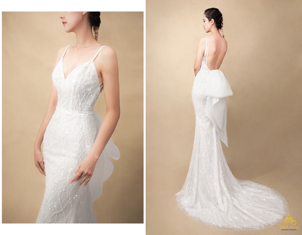 Dành cho những buổi dạ tiệc cưới sang trọng, áo cưới đuôi cá 2 dây cũng là lựa chọn mà cô dâu đồng hồ cát yêu thích. Meera Meera giới thiệu mẫu áo cưới đuôi cá dạ hội 2 dây đầy quyến rũ khoe trọn khuôn ngực đầy đặn và tấm lưng ong gợi cảm, toàn bộ váy được đính kết hoạ tiết gợn sóng giúp làm nổi bật vóc dáng gợi cảm của cô dâu giữa đêm tiệc. Bạn cũng có thể phối thêm phụ kiện đuôi nơ tháo rời để tạo nét cá tính riêng cho bộ trang phục của mình.