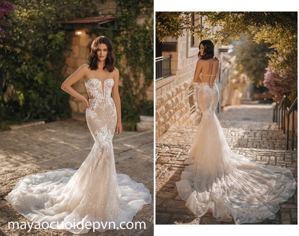 Kiểu dáng váy cưới lý tưởng nhất cho cô dâu đồng hồ cát là áo cưới đuôi cá cúp ngực. Cô dâu sẽ được thoả thích khoe đường cong gợi cảm trong mẫu thiết kế đến từ Berta: dáng áo cưới đuôi cá xuyên thấu thực hiện trên chất vải kim tuyến lấp lánh phối ren có cúp ngực corset xẻ V sâu, hở lưng táo bạo cùng những đường cắt cut-cout tinh tế.