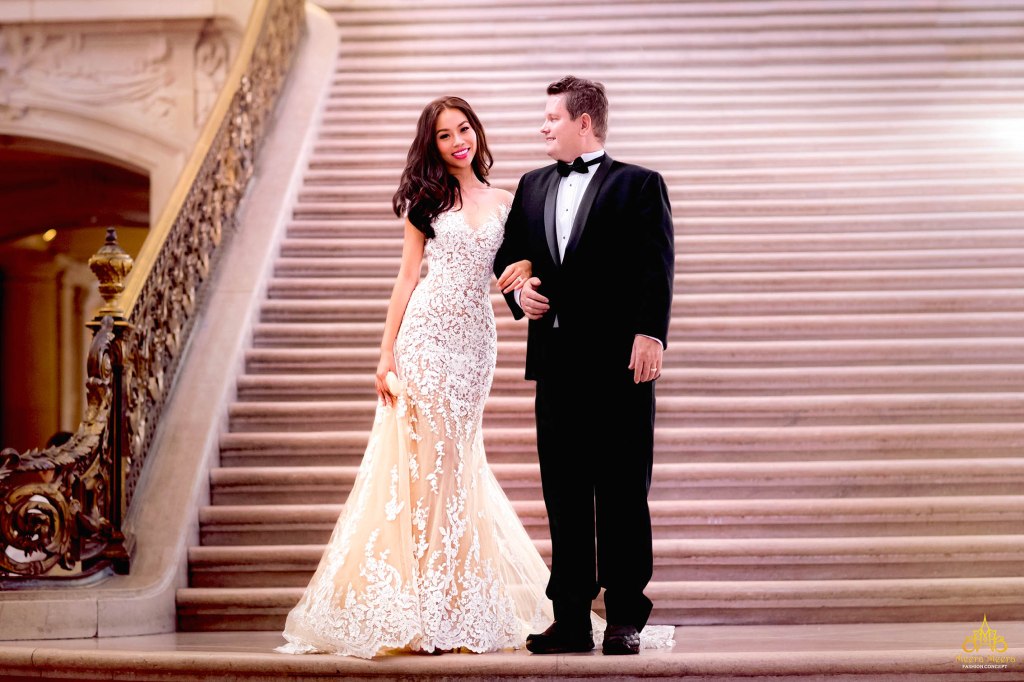 Trong khi đó, Meera Meera Fashion Concept mang đến hình tượng một vị nữ thần ngoài đời thật dành cho cô dâu có 3 vòng chuẩn: dáng áo cưới đuôi cá cúp ngực xẻ V sâu với hệ thống corset bên trong giúp nâng đỡ khuôn ngực căng tròn, nổi bật eo thon và khoe khéo vòng 3 đẫy đà. Cô dâu nữ thần thu hút mọi ánh nhìn với chiếc váy cưới phối hợp nhiều chất liệu được đính kết công phu và tinh xảo.