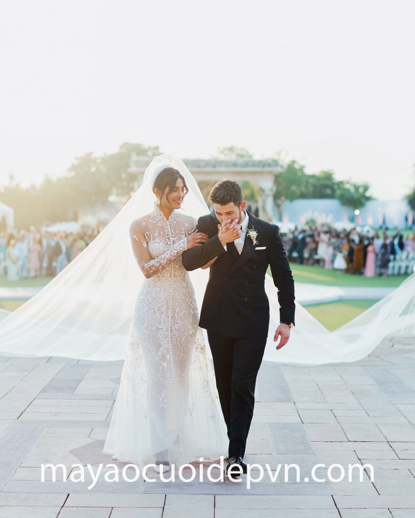 Sở hữu nhan sắc và vóc dáng đẹp như một nữ thần, Hoa hậu Thế giới Priyanka Chopra đã khiến công chúng choáng ngợp khi xuất hiện trong tuyệt tác váy cưới tốn gần 1.826 giờ thêu đến từ thương hiệu Ralph Lauren. Áo cưới đuôi cá cổ cao tay dài xuyên thấu đính kết ren công phu đảm bảo được tính trang trọng cho lễ cưới, đồng thời lại vô cùng gợi cảm với phần thân áo cúp ngực lấp lánh ôm trọn đường cong hoàn mỹ của nàng hoa hậu. Nhà mốt kết hợp thêm phụ kiện khăn voan đội đầu dài gần 23 mét để tăng thêm vẻ hoành tráng cho đám cưới cổ tích của Priyanka Chopra cùng Nick Jonas.