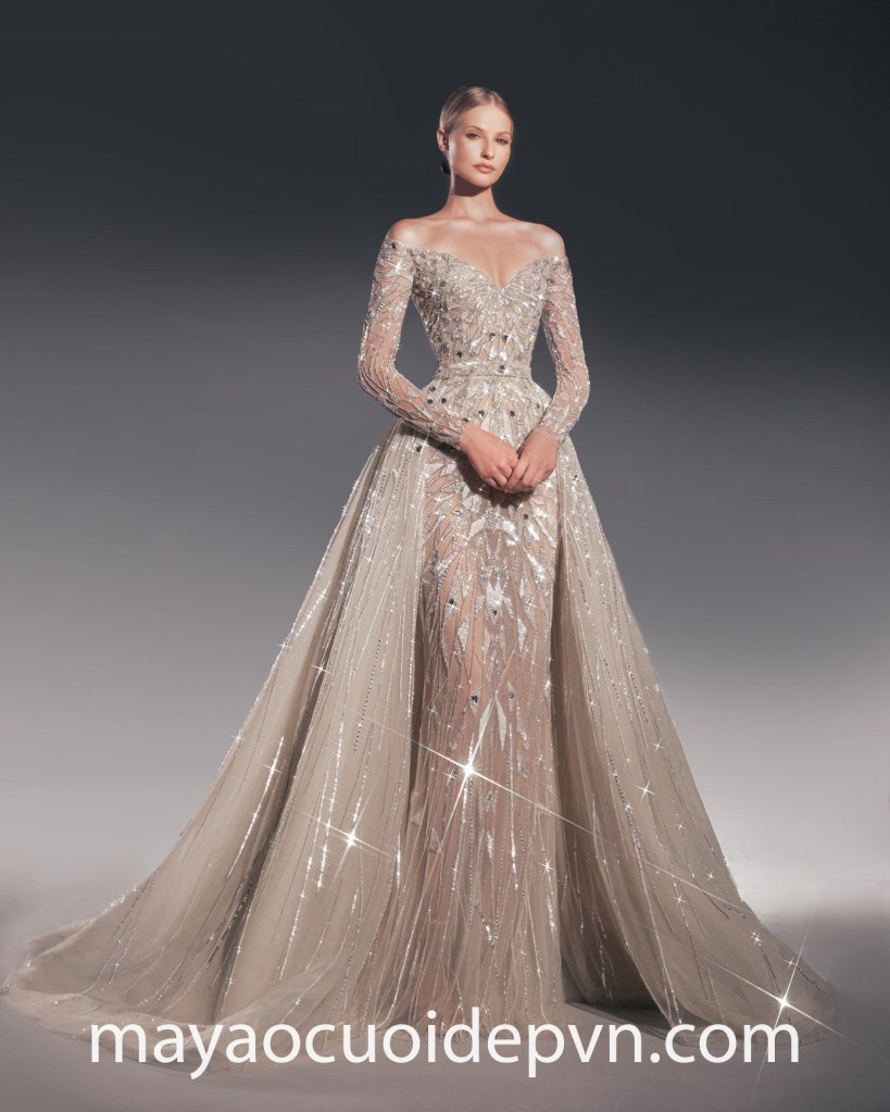 Thương hiệu nổi tiếng thế giới Zuhair Murad mang đến mùa cưới thu đông 2022 những thiết kế vô cùng đặc sắc lấy ý tưởng từ những mảnh gương diệu kỳ. Thiết kế váy cưới trễ vai tay dài xuyên thấu hoàn toàn được phục sức lộng lẫy với những hoạ tiết hình học đính kết kỳ công, tạo nên độ bắt sáng hoàn hảo và tôn vinh vóc dáng siêu thực của cô dâu thời thượng.