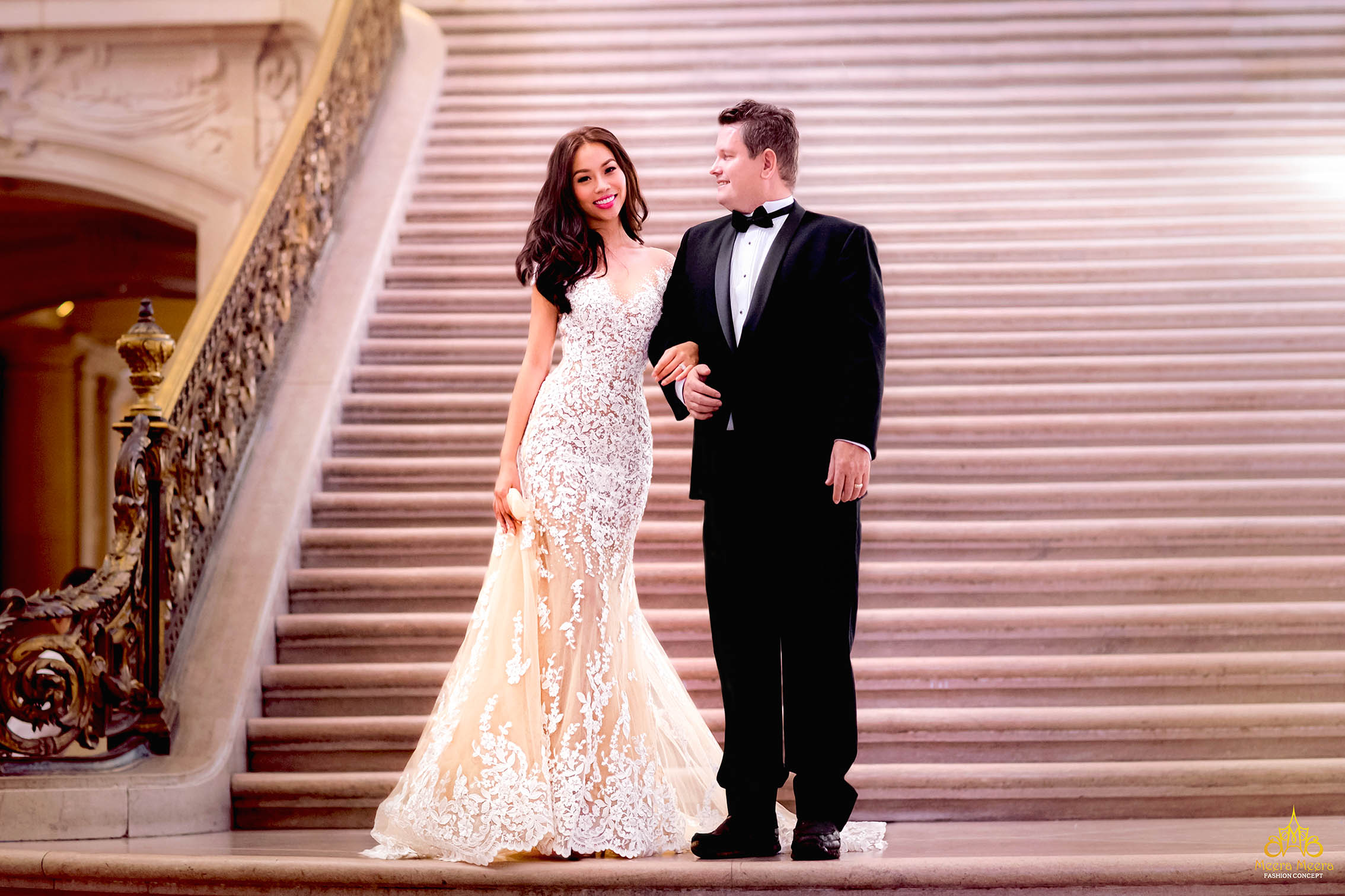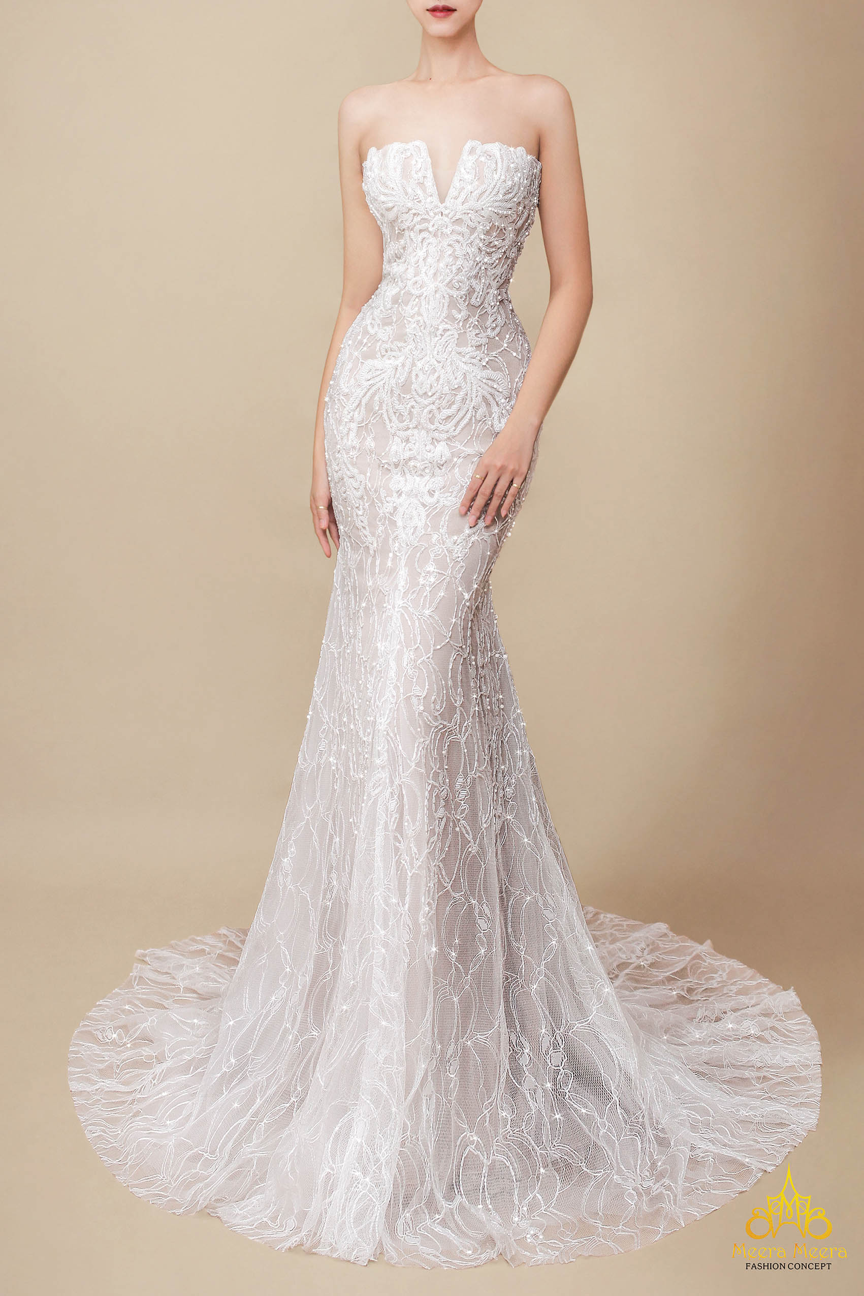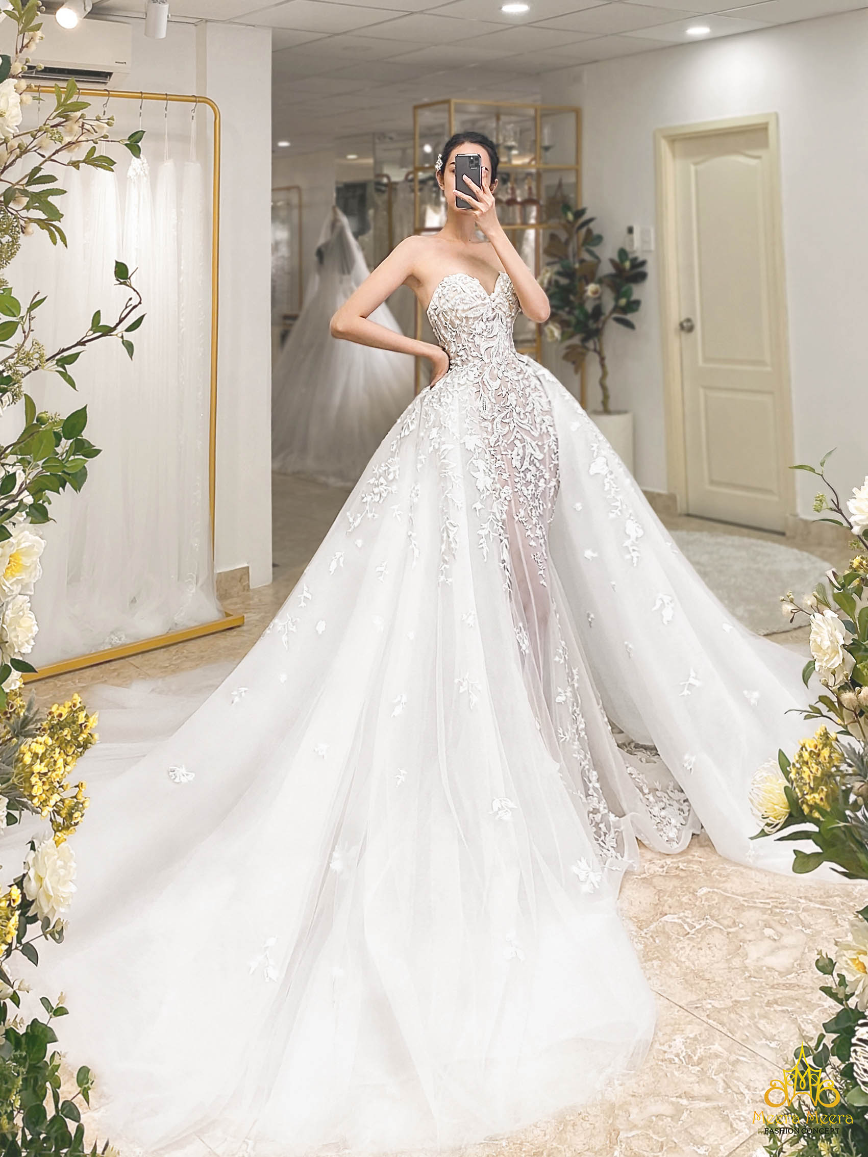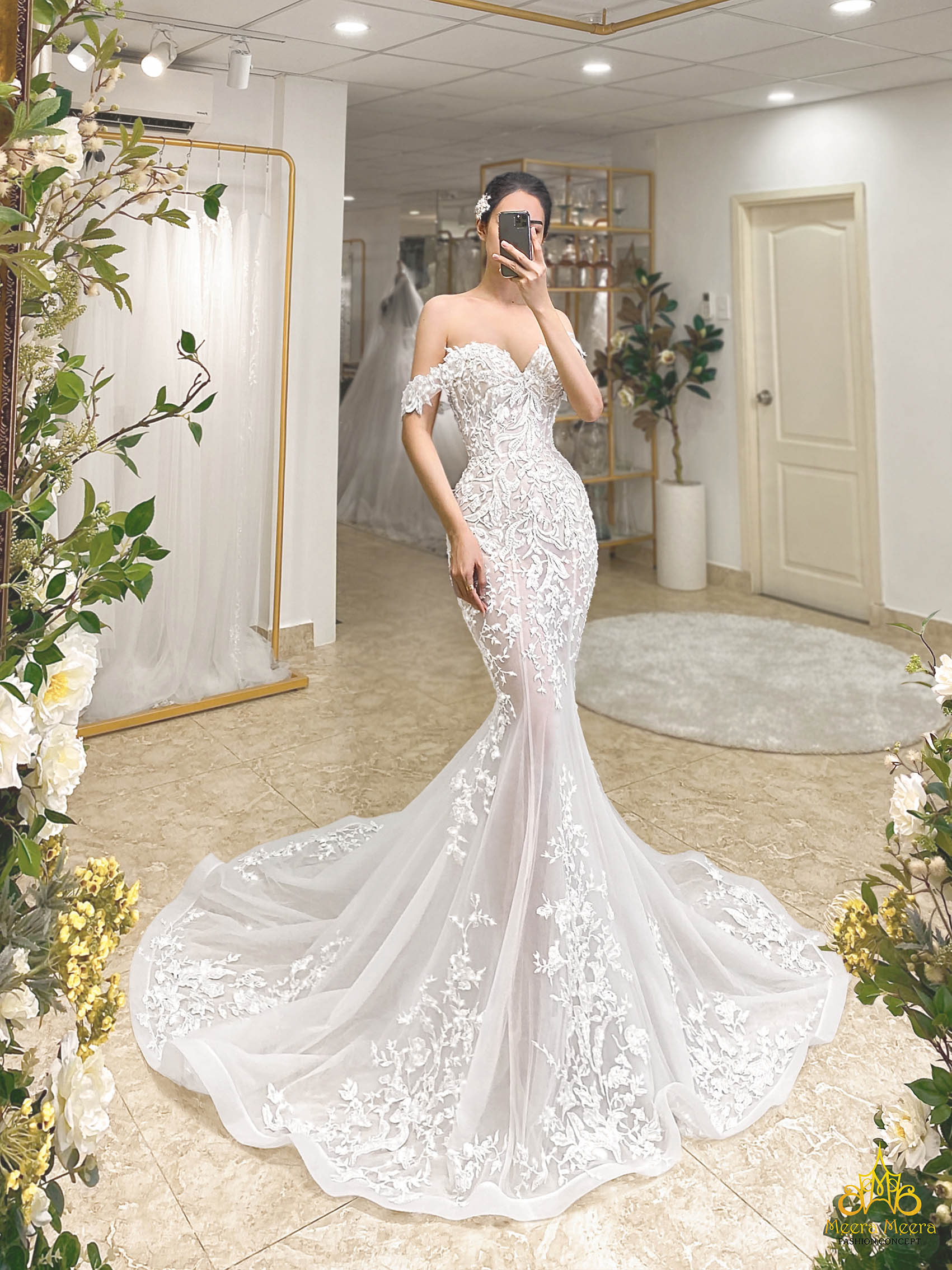 Với những cô dâu muốn mình trông thật lộng lẫy và xa hoa trong đám cưới cổ tích, mẫu áo cưới đuôi cá 2 trong 1 từ Meera Meera Fashion Concept sinh ra dành riêng cho bạn. Xinh đẹp như một nữ thần, cô dâu khoe trọn thân hình đồng hồ cát với dáng váy đuôi cá trễ vai gợi cảm, hoạ tiết trang trí được sắp xếp bố cục lấy cảm hứng từ đại dương sẽ tôn vinh 3 vòng hoàn hảo của bạn trên chất vải xuyên thấu khoe da thịt gợi cảm.
