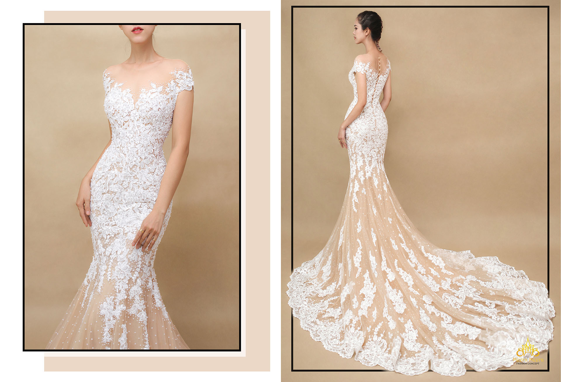 Cô dâu sở hữu đường cong đẹp cùng số đo 3 vòng chuẩn sẽ càng thêm hoàn hảo khi diện lên người mẫu váy cưới đuôi cá màu da của Meera Meera Fashion Concept. Kiểu váy cưới tôn dáng với những hoạ tiết ren được sắp đặt khéo léo tạo nên cổ áo trễ vai giúp khoe trọn xương quai xanh và tạo hiệu ứng vòng một nở nang. Hoạ tiết ren rơi nhẹ từ đầu gối làm cho cô dâu thêm cao ráo và vô cùng hút mắt với chân váy xoè dài diềm ren lỗng lẫy.