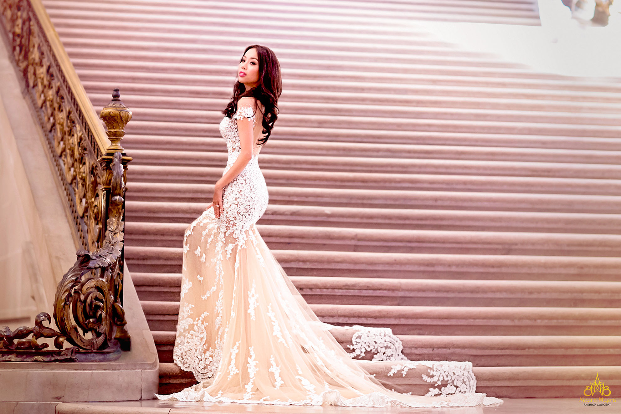 Trong khi đó, Meera Meera Fashion Concept mang đến hình tượng một vị nữ thần ngoài đời thật dành cho cô dâu có 3 vòng chuẩn: dáng áo cưới đuôi cá cúp ngực xẻ V sâu với hệ thống corset bên trong giúp nâng đỡ khuôn ngực căng tròn, nổi bật eo thon và khoe khéo vòng 3 đẫy đà. Cô dâu nữ thần thu hút mọi ánh nhìn với chiếc váy cưới phối hợp nhiều chất liệu được đính kết công phu và tinh xảo.
