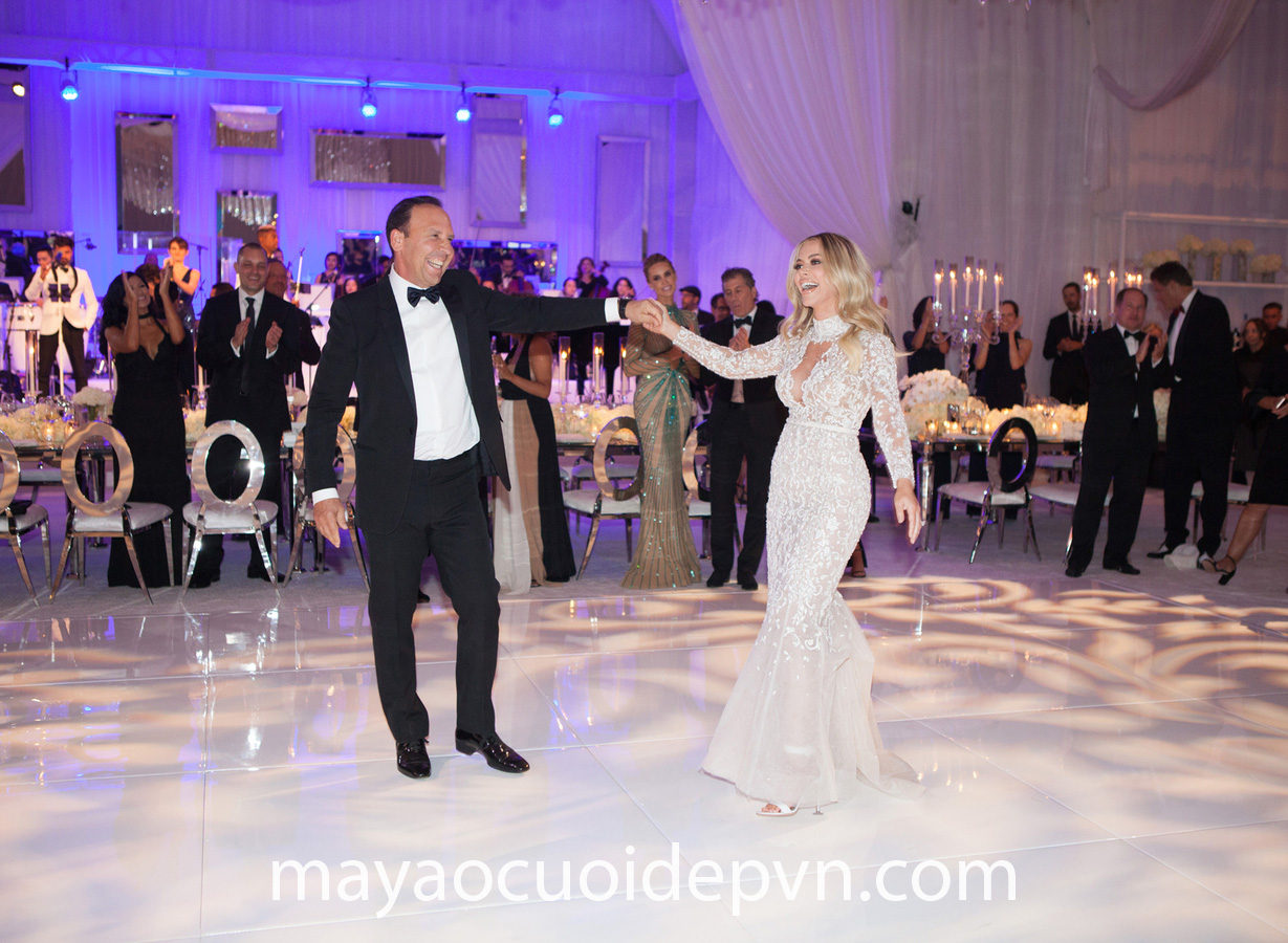 Với thiết kế đuôi cá ôm sát, đồng thời lại vừa trễ vai, vừa hở lưng sâu đầy táo bạo, bộ váy này đã tôn lên được hết mọi ưu điểm ngoại hình đồng hồ cát nóng bỏng của cô dâu. Ngoài ra, phần ren thêu trên váy cũng được xem là rất tinh xảo cùng hàng loạt chi tiết ý nghĩa được đính kết vô cùng kỳ công.