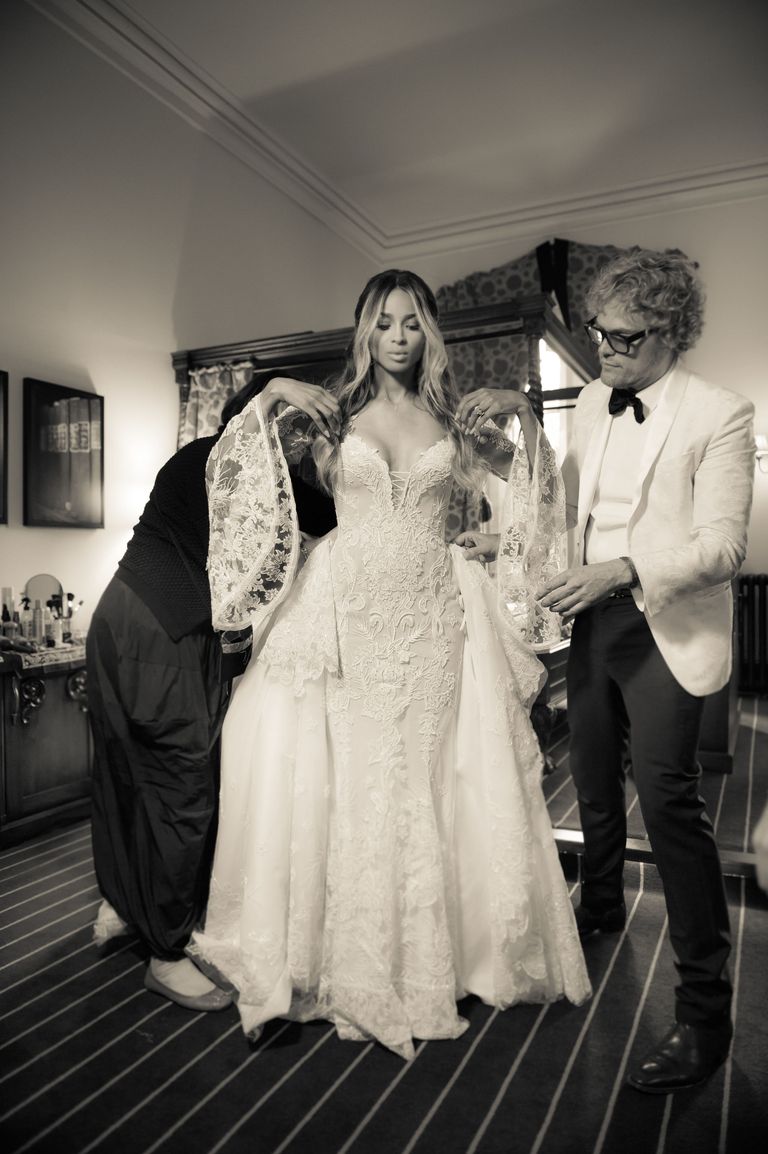 Nữ ca sĩ gợi cảm Ciara khiến fan hâm mộ xuýt xoa khi diện lên người mẫu mẫu thiết kế vô cùng ấn tượng và lộng lẫy đến từ thương hiệu Roberto Cavalli, được thiết kế bởi Peter Dundas. Váy cưới 2 trong 1 với thân áo đuôi cá corset xẻ ngực sâu khoe trọn đôi gò bồng đảo sexy của nàng ca sĩ, tay áo dài ống loe tạo nên nét điệu đà cho thiết kế và toàn bộ thân váy được đính kết ren công phu. Đặc biệt, phần tùng váy xoè có thể tháo rời là phụ kiện giúp tăng thêm mức độ lộng lẫy cho cô dâu nổi tiếng.