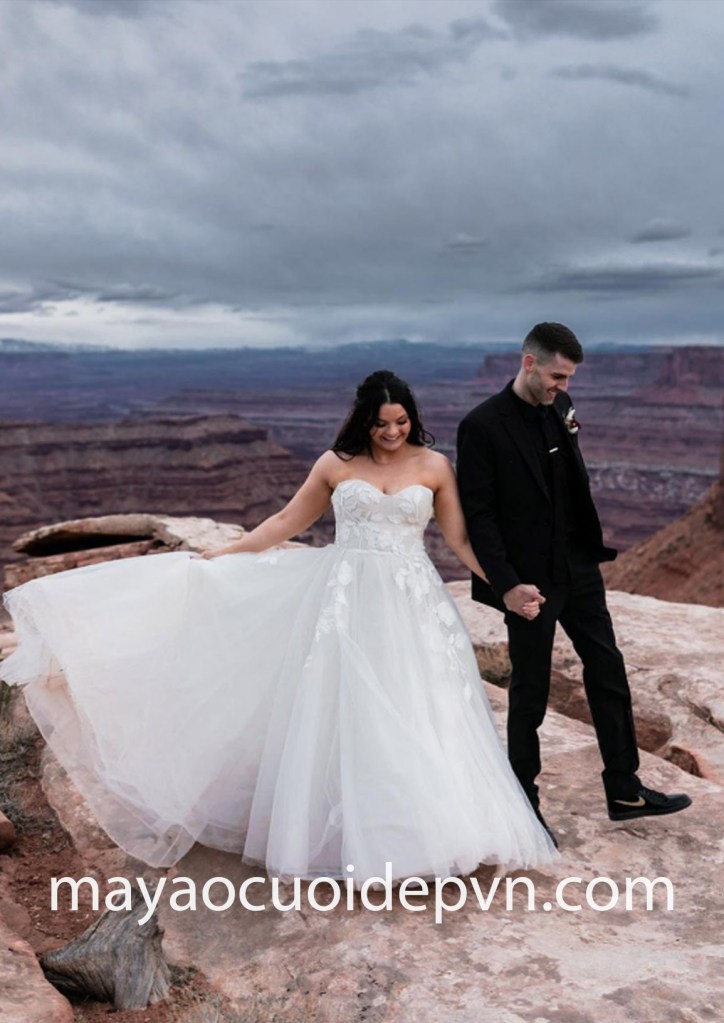 Một kiểu váy tiếp theo cũng rất hiệu quả trong việc khắc phục khuyết điểm bắp tay to là áo cưới sát nách big size. Kiểu cổ áo linh hoạt lại rất thoải mái này sẽ giúp tập trung ánh nhìn vào vòng một gợi cảm của bạn, cân bằng cổ và vai thô, đồng thời đánh lạc hướng sự tập trung vào bắp tay to đi cùng chân váy chữ A lưới xoè bay bổng.