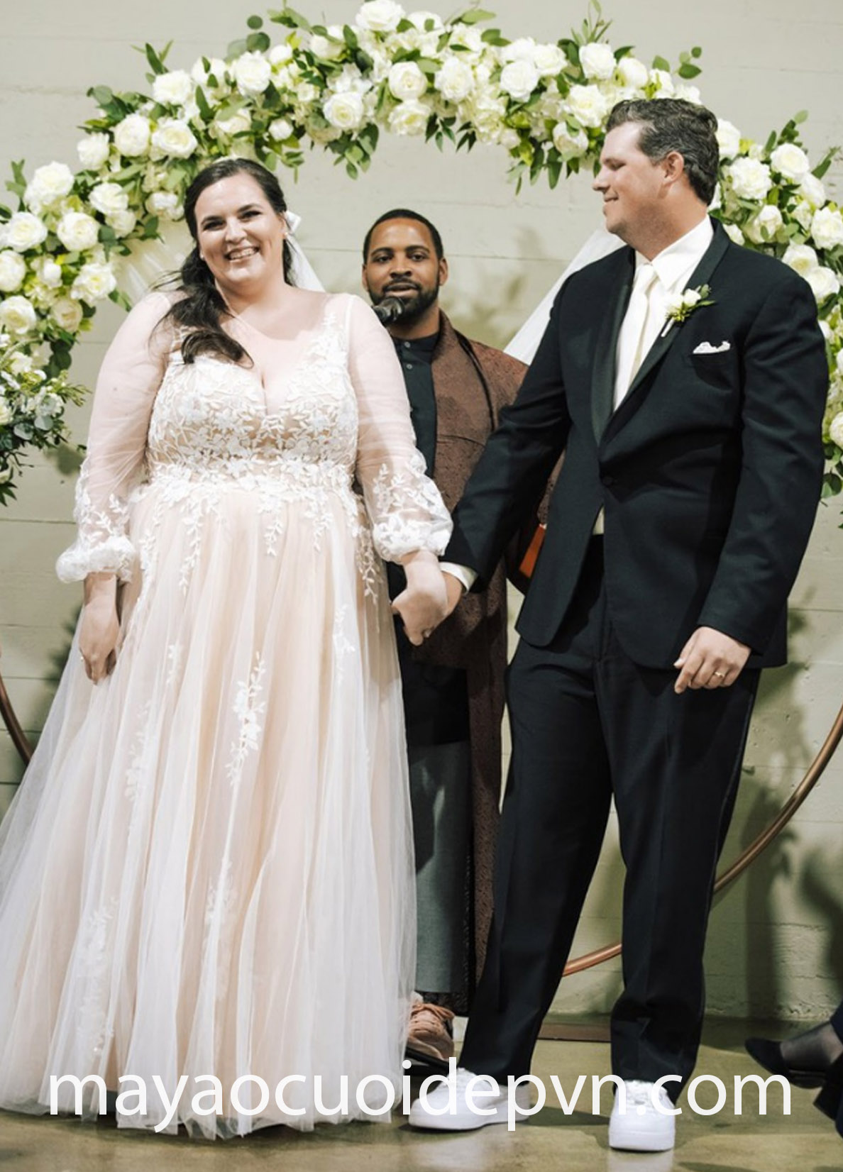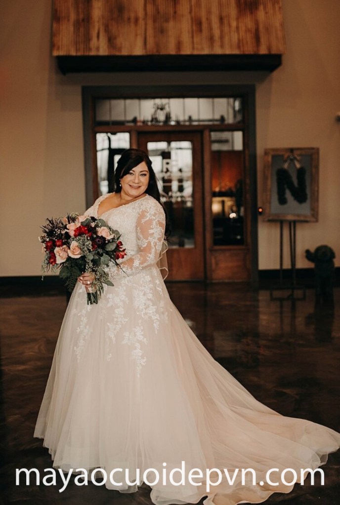 Những cô dâu tổ chức lễ cưới trong nhà thờ hoặc yêu thích phong cách lịch thiệp cũng có thể diện lên người những mẫu áo cưới big size tay dài. Bí quyết mặc đẹp là bạn nên chọn các kiểu tay áo xuyên thấu được trang trí với ren hoặc đính kết có mật độ vừa phải, không quá dày đặc để cánh tay trở nên nhẹ nhàng hơn.
