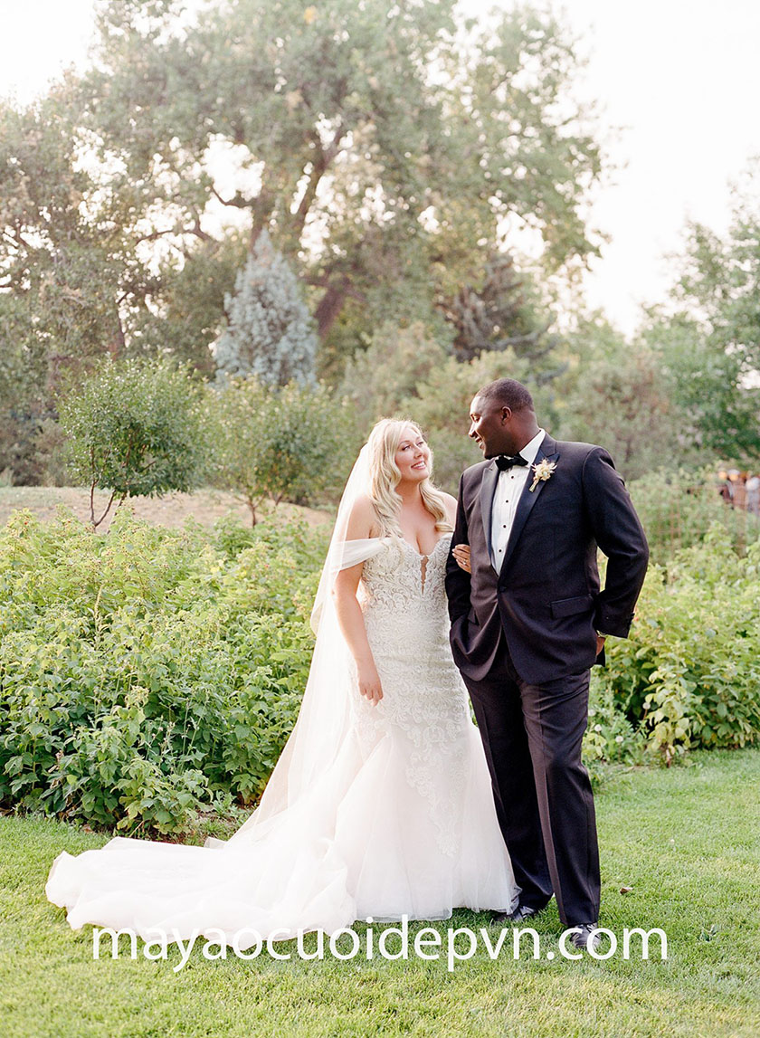 Kiểu áo cưới đuôi cá trễ vai big size cũng là một gợi ý tuyệt vời cho cô dâu ngoại cỡ muốn khoe đường cong cơ thể. Thiết kế đến từ Maggie Sottero xuất hiện lộng lẫy với phom váy đuôi cá tùng lưới xếp múi có đuôi dài thướt tha, cổ áo trễ vai với đường xẻ ngực sâu khoe trọn đôi gò bồng đảo kết hợp cùng điểm nhấn hoạ tiết ren uốn lượn nhịp nhàng theo số đo 3 vòng.