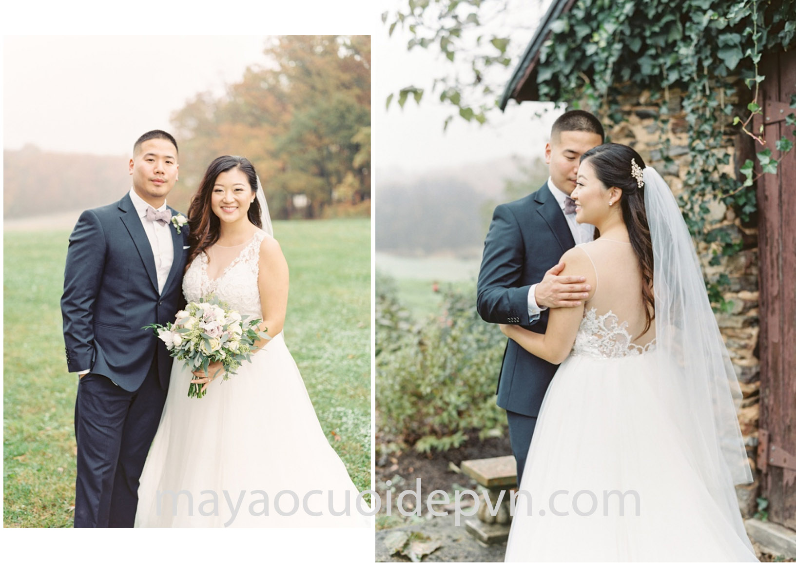 Diện lên người chiếc áo cưới Watters nhẹ nhàng thực hiện trên chất vải lưới bay bổng kết hợp ren tạo điểm nhấn tuyệt đẹp ở cổ áo, cô dâu mũm mĩm rất khéo léo khi kết hợp phụ kiện mạn che mặt trơn để bờ vai thêm phần thanh thoát.