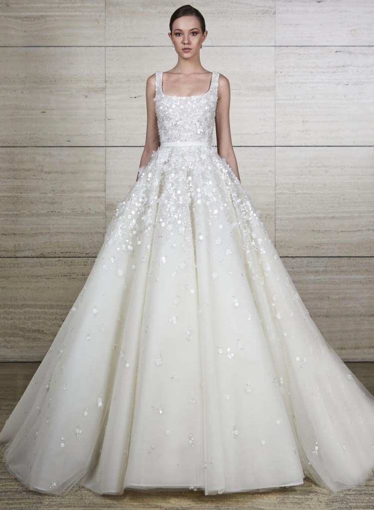 Mẫu váy cưới thứ hai của Son Ye Jin đến từ nhà mốt xa xỉ Elie Saab. Thiết kế váy cưới công chúa đẹp tuyệt mỹ nằm trong BST cưới xuân hè 2022, nổi bật với cổ vuông thời thượng khoe trọn khuôn ngực nõn nà cùng bờ xương quai xanh tuyệt đẹp.