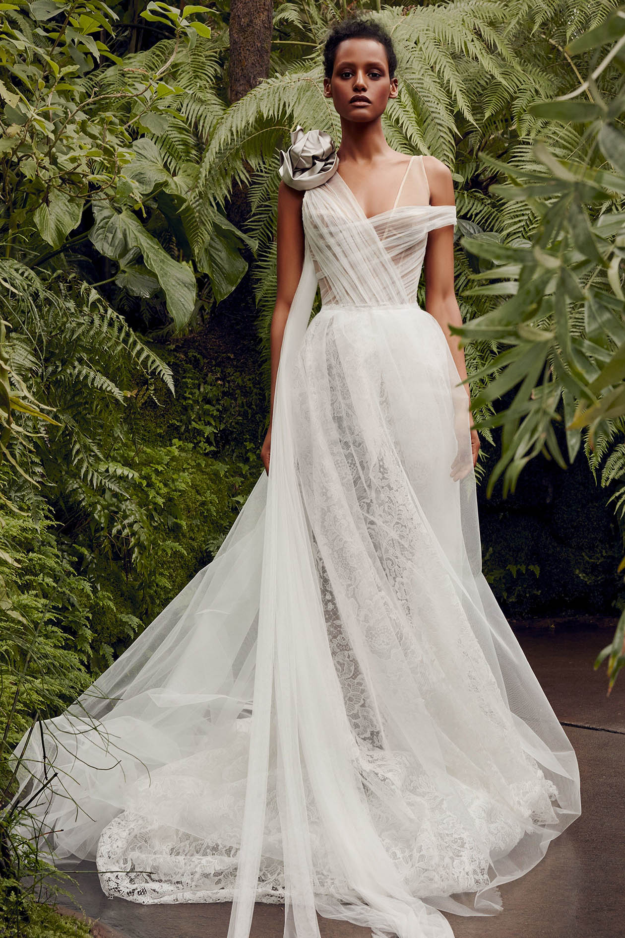 Mẫu thiết kế áo cưới 2 trong 1 có thiết kế linh hoạt khi phần tùng váy lưới bồng bềnh bên ngoài có thể tháo rời dễ dàng, để lộ dáng váy đuôi cá bán xuyên thấu tôn vinh đường cong cơ thể. Theo thông tin, váy của thương hiệu Isarel có giá dao động quanh mức 200 triệu đồng và lên đến 300 triệu đồng