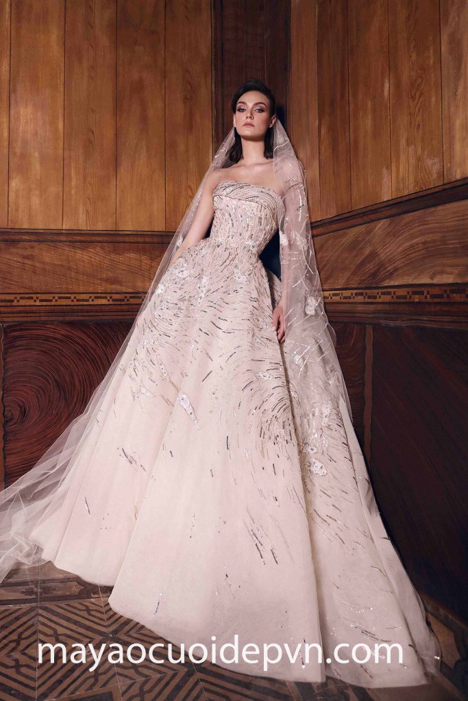 Thương hiệu xa xỉ lừng danh thế giới – Zuhair Murad kết màn bằng một mẫu áo cưới công chúa Haute Couture tuyệt đẹp dành riêng cho mùa cưới xuân hè 2023. Thiết kế nổi bật với dáng váy công chúa tùng xoè lộng lẫy, cúp ngực ngang thời thượng kết hợp hoạ tiết đính kết bậc thầy tạo nên hiệu ứng xoáy nước lấp lánh đáng kinh ngạc.