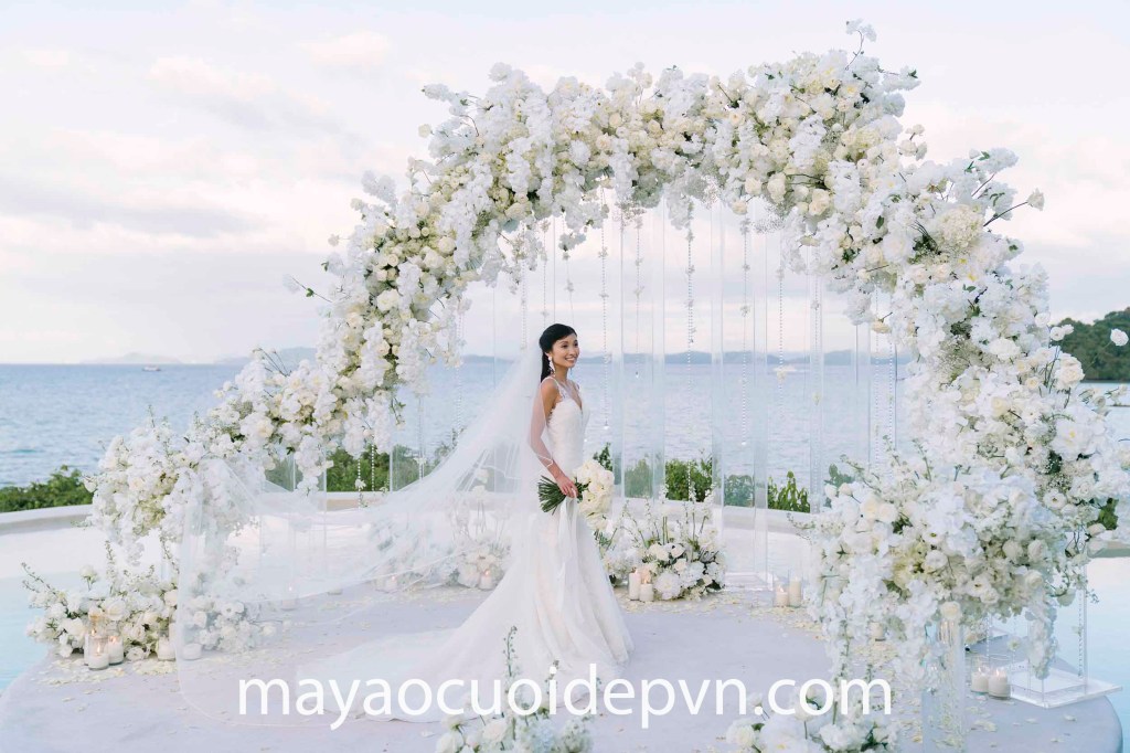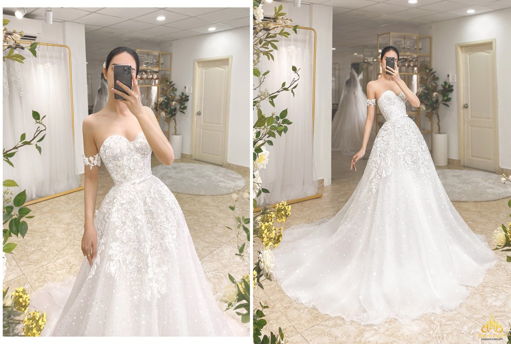 Ngoài ra, những mẫu áo cưới thiết kế đặc biệt cũng sẽ góp phần tạo nên diện mạo ấn tượng cho bạn trong đám cưới cổ tích ở biển. Mẫu áo cưới độc bản đến từ thương hiệu cưới cao cấp Meera Meera Fashion Concept mang đến cho bạn sự duyên dáng, nền nã của một tiểu thư quý phái với form váy cưới tùng chuông trứ danh. Thân áo corset cúp ngực sexy đi kèm phụ kiện tay áo trễ vai quý phái. Toàn bộ thân váy trang hoàng bởi hoạ tiết trang trí thủ công, bắt sáng tinh tế theo từng chuyển động của cô dâu sành điệu.