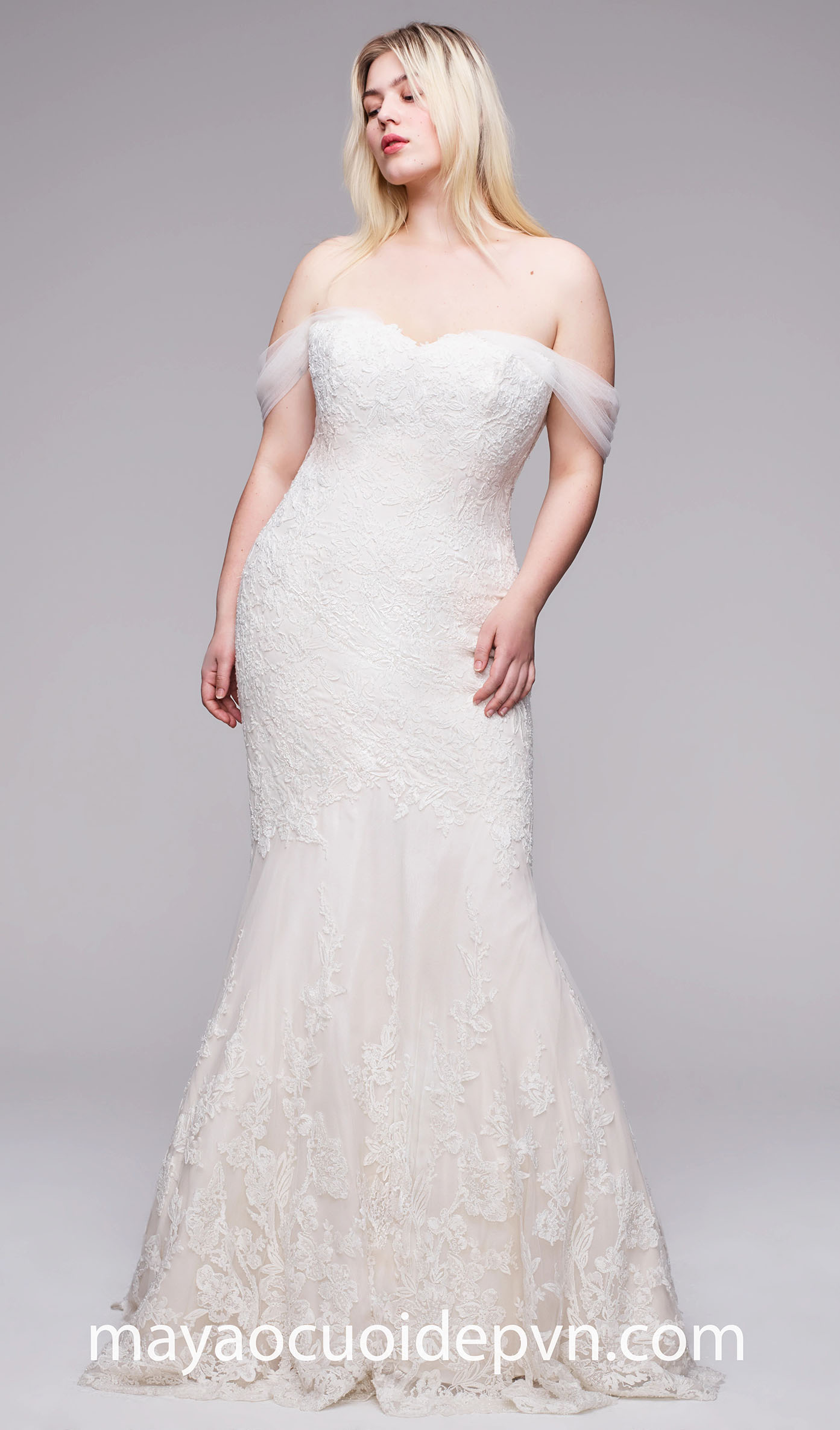 Cô dâu mập mũm mĩm vẫn có thể dễ dàng khoe đường cong quyến rũ trong mẫu áo cưới đuôi cá big size dự tiệc cưới biển. Thân áo kết ren nữ tính đi cùng cổ áo trễ vai bằng lưới sẽ giúp bạn cân đối cơ thể một cách thoải mái nhất.