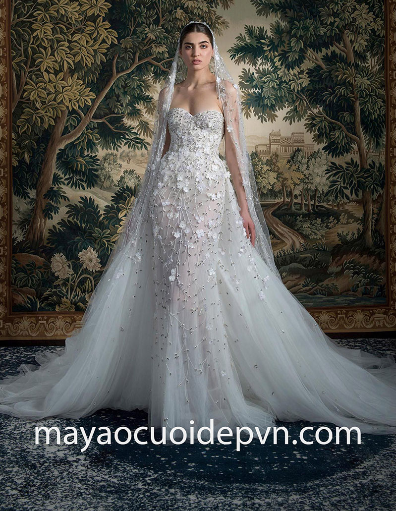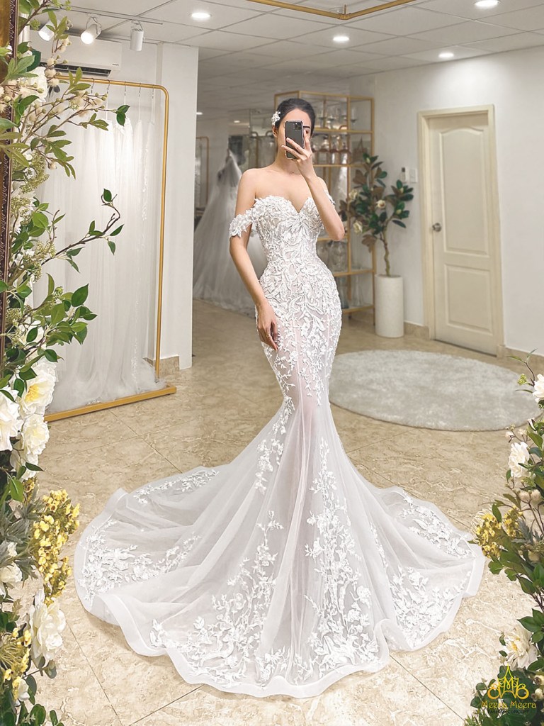 Nhà mốt cao cấp Meera Meera Fashion Concept giúp cô dâu thiếu đốt mọi ánh nhìn trong mẫu áo cưới đuôi cá xuyên thấu vô cùng gợi cảm. Thân áo corset cúp tim siết eo nâng ngực giúp cô dâu phô diễn trọn vẹn vóc dáng đồng hồ cát với tay áo trễ vai quý phái, thu hút toàn bộ sự tập trung bằng những chi tiết trang trí, đính kết công phu tạo nên vẻ ngoài hoàn hảo cho cô dâu nữ thần.