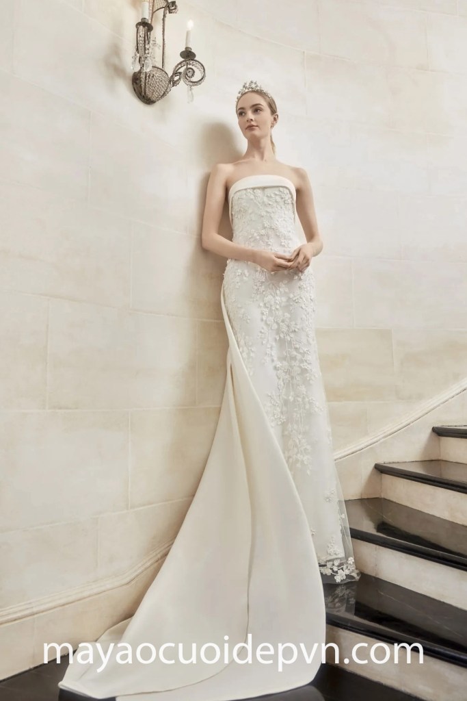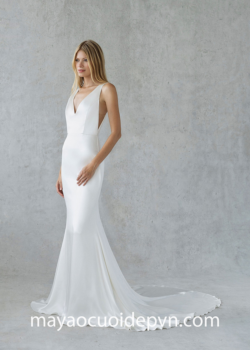 Phong cách tối giản vượt thời gian vẫn luôn là một trong những xu hướng được ưa thích nhất của mọi cô dâu. Mẫu áo cưới minimalist của Alexandra Grecco với form váy đuôi cá tôn dáng, thực hiện trên nền vải lụa ôm sát body gợi cảm sẽ hoàn toàn thích hợp cho một buổi tiệc cưới thân mật trên biển.