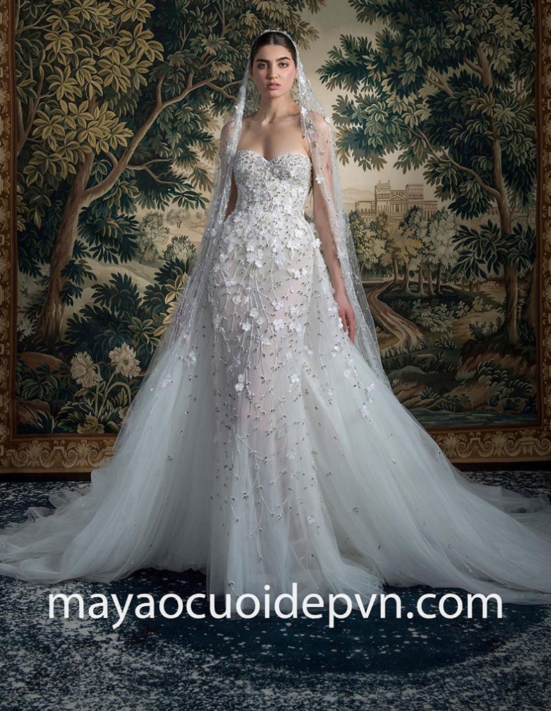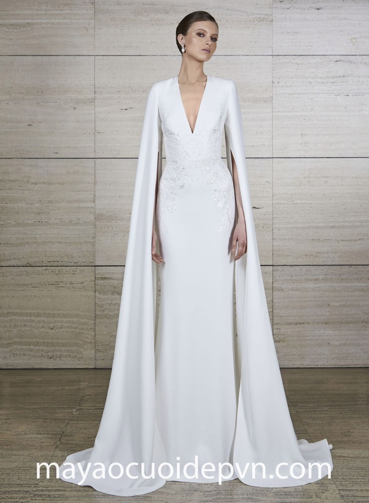 “Ông trùm Haute Couture” Elie Saab mang đến cho các cô dâu tương lai mẫu thiết kế váy cưới đi biển theo phong cách của một nữ thần. Kiểu váy đuôi cá lụa là ôm theo đường cong, kết hợp cùng cổ V xẻ sâu và tay áo choàng cape tạo điểm nhấn quý phái và giúp tôn vinh vóc dáng thanh mảnh của cô dâu. Thân áo đính kết nhẹ nhàng, lấp lánh hoàn thiện vẻ sang trọng cho thiết kế đầy thanh lịch.