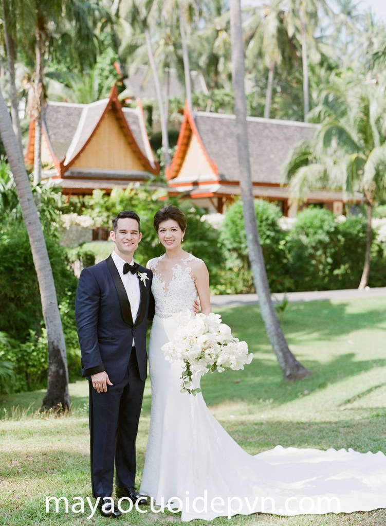 Cô dâu Thái Lan đã có một sự lựa chọn tuyệt vời khi khoe dáng nuột nà trong bộ váy cưới đuôi cá tùng lụa của Pronovias. Mẫu váy với thân trên xuyên thấu điểm ren lãng mạn, kết hợp cùng chân váy lụa có đuôi dài thướt tha mang đến sự nữ tính trọn vẹn cho cô dâu.