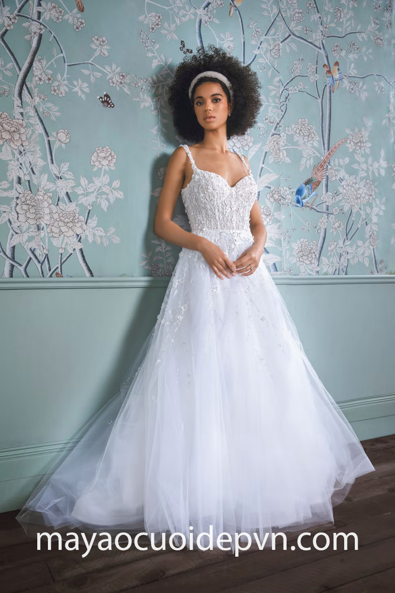“Áo cưới quốc dân” có form váy chữ A dễ di chuyển nay càng thêm bay bổng khi thực hiện trên nền vải lưới tùng xoè nhẹ tênh. Toàn bộ điểm nhấn tập trung ở thân trên phối ren, đi cùng hoạ tiết trang trí lấp lánh làm bừng sáng nhan sắc xinh đẹp của cô dâu thanh lịch.