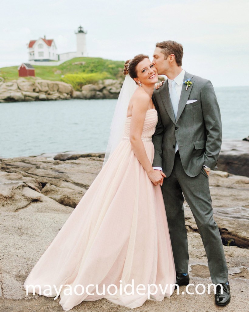 Áo cưới đơn giản luôn là sự lựa chọn lý tưởng cho các cô dâu ưa thích phong cách nhẹ nhàng. Các chất liệu vải bay bổng như lưới, hay mềm mại như lụa, satin mỏng sẽ là một gợi ý tuyệt vời cho các đám cưới bãi biển. Mẫu váy cưới chữ A hai dây của hãng Amsale, thực hiện trên chất vải satin đứng form đã giúp cô dâu vô cùng thoải mái và tự tin trong đám cưới hướng ra vùng biển lộng gió.